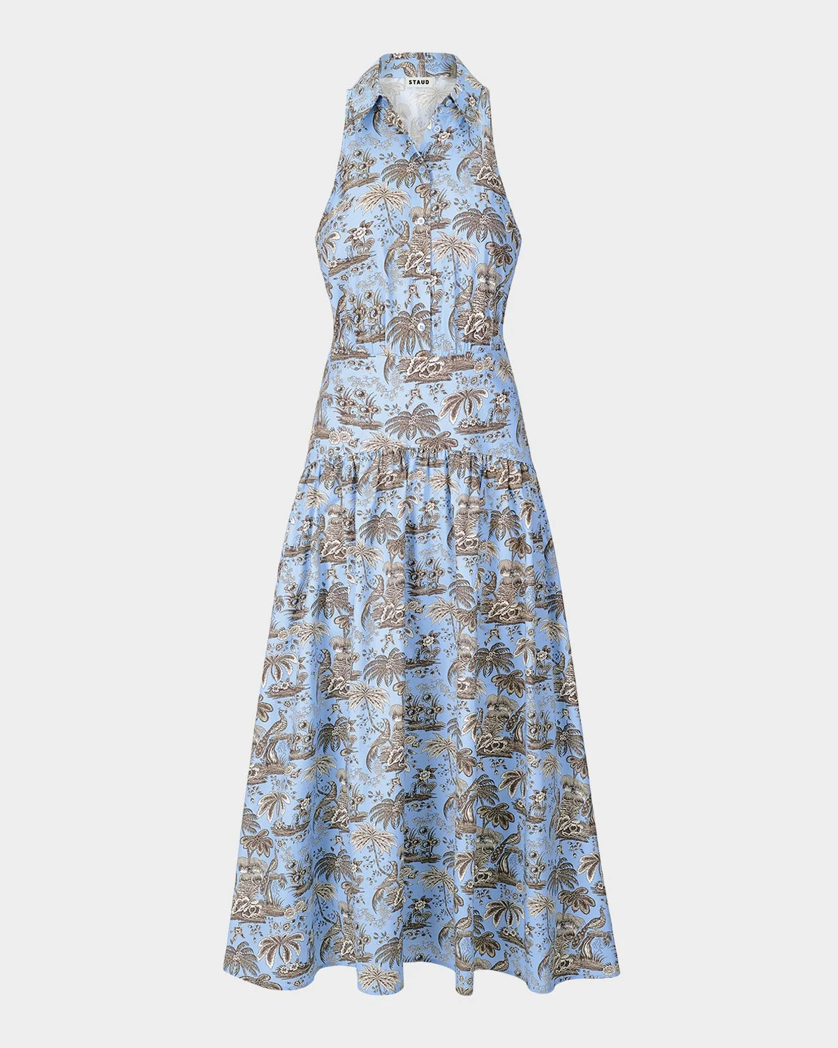 STAUD & apos;s "Romy" dress is crafted from stretch cotton in an intricate toile print & nbsp; Approx. 55"L from shoulder to hem Classic collared neckline; partial button front Sleeveless Curved yoke waist Hem falls below the knee A-line silhouette Cotton/spandex Dry clean Imported