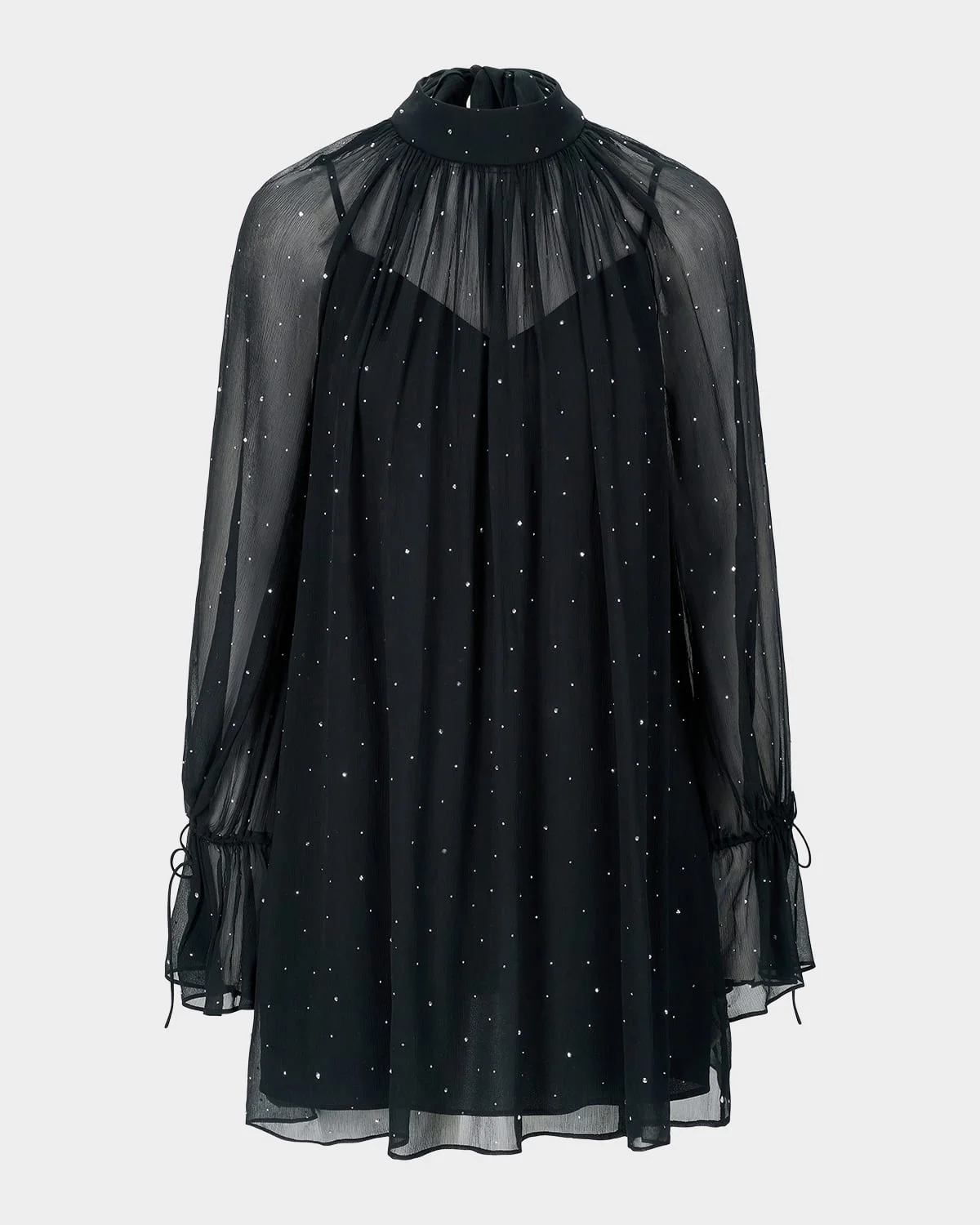 Made from an embellished crinkled chiffon fabric, STAUD's "Roux" dress features subtle shirring at the neckline to create volume Features a removable slip for added versatility Approx. 32"L from shoulder to hem High neckline; selfties behind the neck Long poet sleeves; selftie cuffs Hem falls above the knee Shift silhouette Slipover style Rayon/cellulose acetate Dry clean Imported