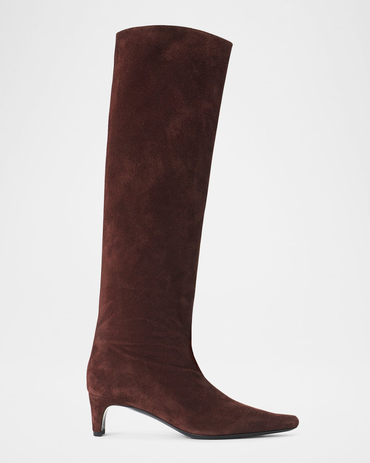 - Staud 70mm "Wally" colorblocked patchwork suede tall boots. - 2.8" covered heel. - Tapered square toe. - Pull-on style. - Leather lining and sole. - Made in Portugal.