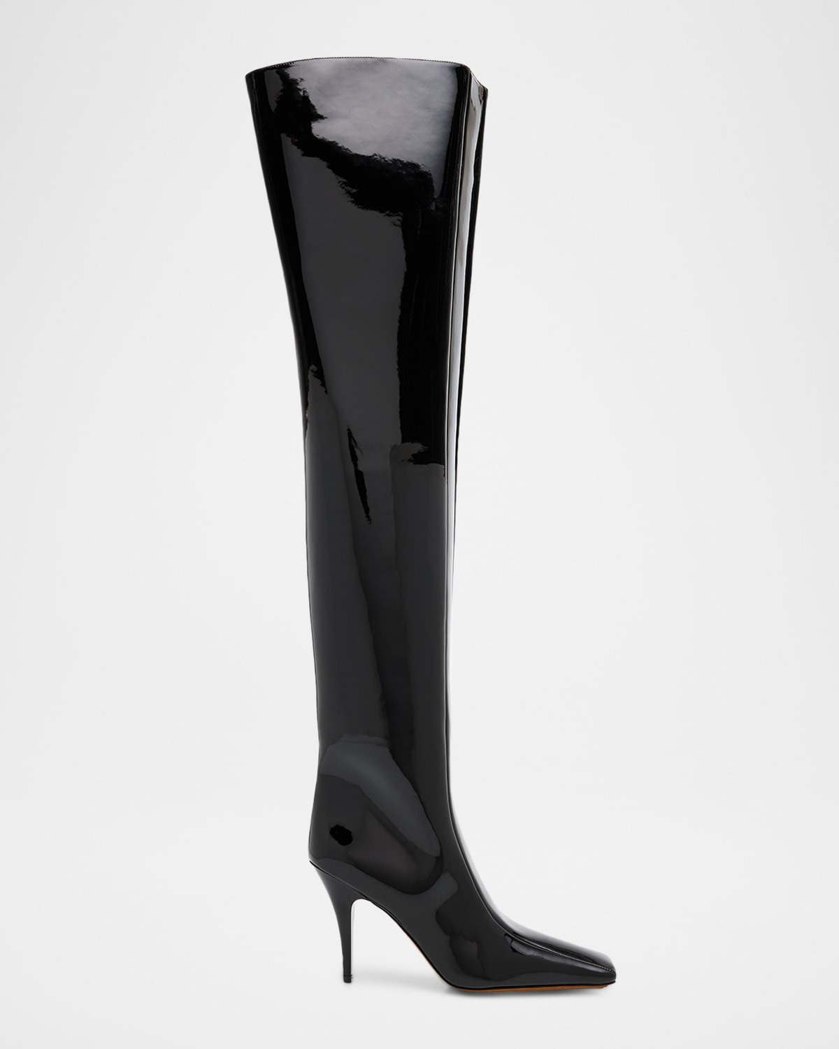 Handsculpted from a patent vegan alternative to animal leather, these glossy thighhigh boots by Stella McCartney pair perfectly with a slinky mini dress. 3.75 in / 95 mm covered stiletto heel Pointed square toe Side zipper for easy on/off Manmade outsole Lining: viscose Made in Italy