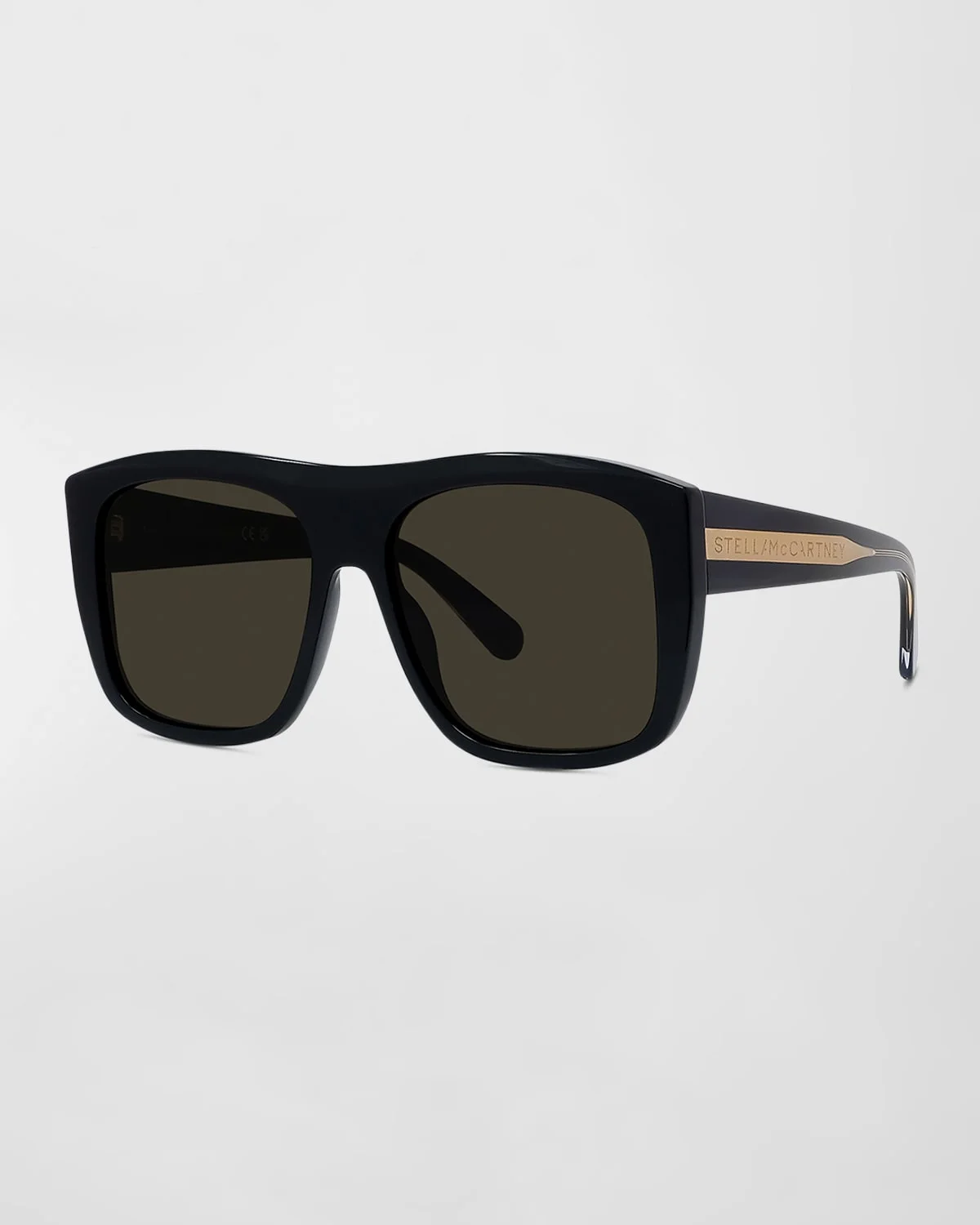 Stella McCartney square sunglasses in acetate & nbsp; Eye/bridge/temple (in mm): 50-18-140 Solid lenses Saddle nose bridge & nbsp; Thin, tapered arms; logo at the sides & nbsp; Acetate/nylon/polyamide Hand wash 100% UVA/UVB protection Imported Proposition 65 warning for California residents