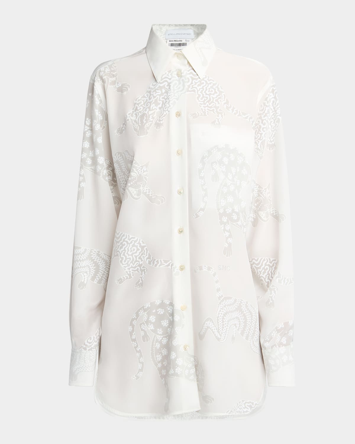 - Stella McCartney burnout blouse features a playful feline motif on rich, textured fabric - Point collar - Long sleeves; button cuffs - Button closure - Relaxed fit - Silk - Dry clean - Made in Romania