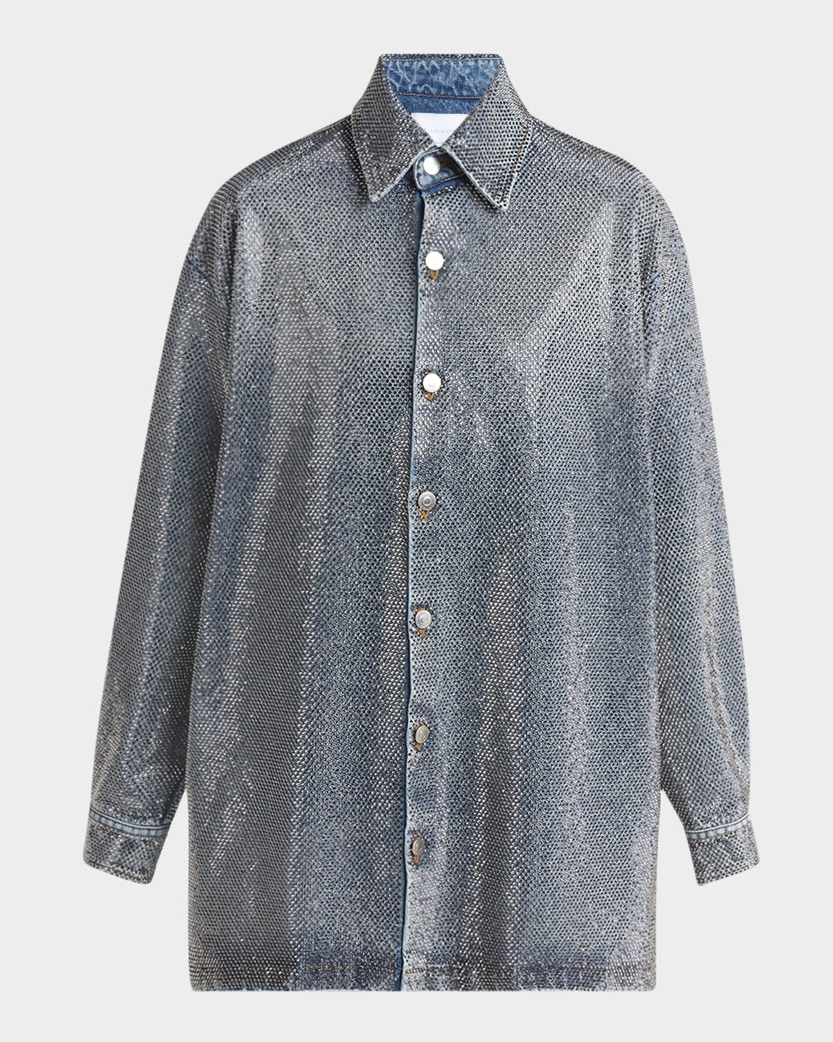 Stella McCartney denim overshirt features crystal hotfix embellishment Spread collar; button front Long sleeves; button cuffs Oversized fit Back yoke Cotton self/lining Dry clean Made in Italy