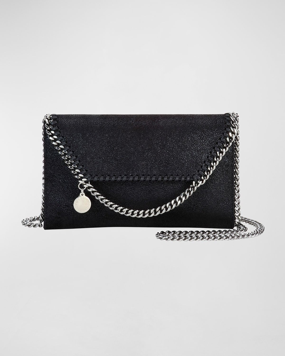 - Stella McCartney "Falabella" crossbody wallet crafted from the brand's signature grained vegan shaggy deer leather alternative - Signature whipstitching and curb-chain detail - Chain shoulder strap - Flap top with snap closure - Inside, logo fabric lining; one interior pocket - Approx. 5.5"H x 8.7"W x 1"D - Made in Italy