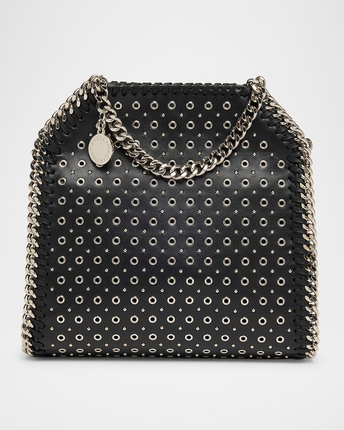 - Stella McCartney "Falabella" alter mat polyester bag features allover eyelet embellishments - Engraved logo charm medallion - Dual top handles - Adjustable crossbody strap - Magnetic top closure - Interior slip pocket - One main compartment - Approx. 7.1"W x 6.9"H x 2.36"D - Spot clean - Made in Italy