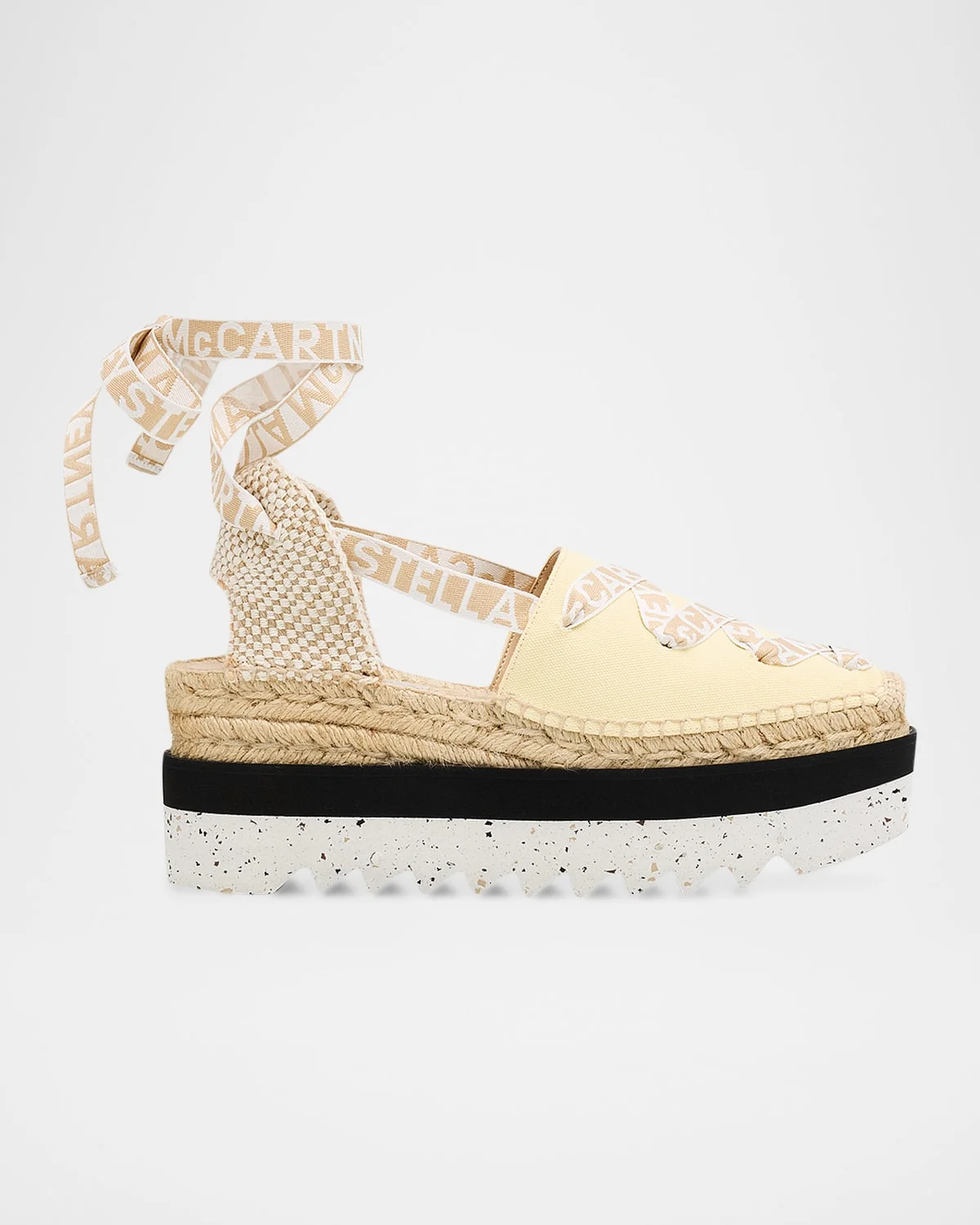 Stella McCartney "Gaia" organic canvas espadrille platform sandals. 3.3" braidedjute heel. Round jute cap toe. Logoembossed laceup vamp. Multilace ties crisscross over the foot and fasten neatly at the ankle. Textile lining. Platform rubber sawtooth sole. Spot clean. Item runs small, consider ordering a size up Made in Italy.