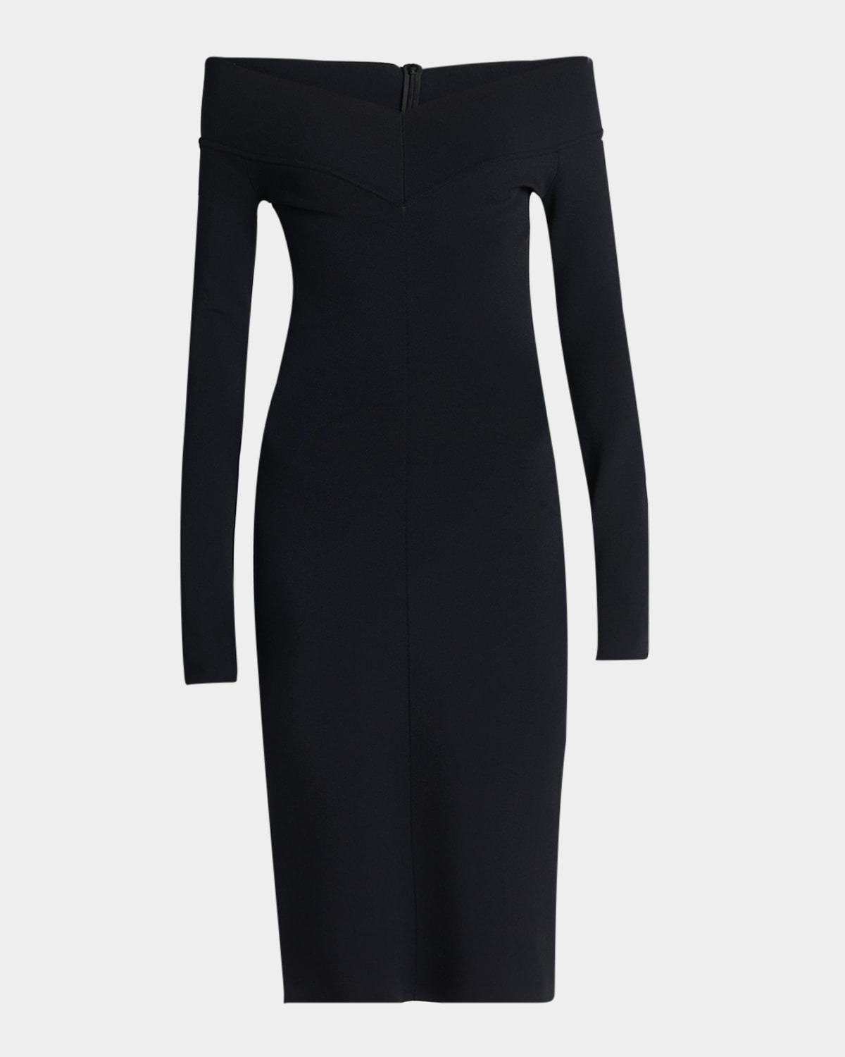 - Stella McCartney compact knit dress in - Off-the-shoulder sweetheart neckline - Long sleeves - Hem falls below the knee - Body-skimming silhouette - Zip closure - Viscose/polyester - Dry clean - Made in Italy