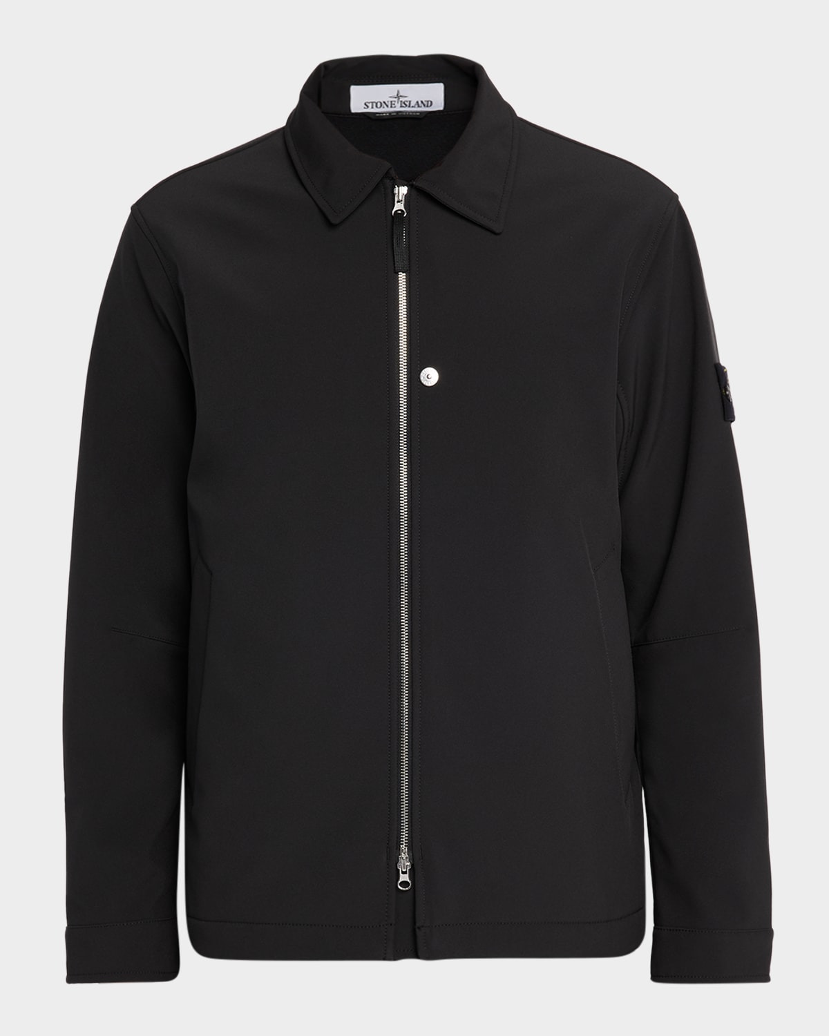 - Despite the soft shell of this Stone Island jacket, the garment itself is structured. The breathable jacket provides a dry, comfortable fit with a water and wind-resistant inner membrane. - Spread collar - Two-way zipper with two snaps - Long sleeves; adjustable cuffs - Logo badge on the left arm - Side slip pockets - Yoked back - Polyester/elastane/spandex - Lining: Polyester - Machine wash cold - Imported