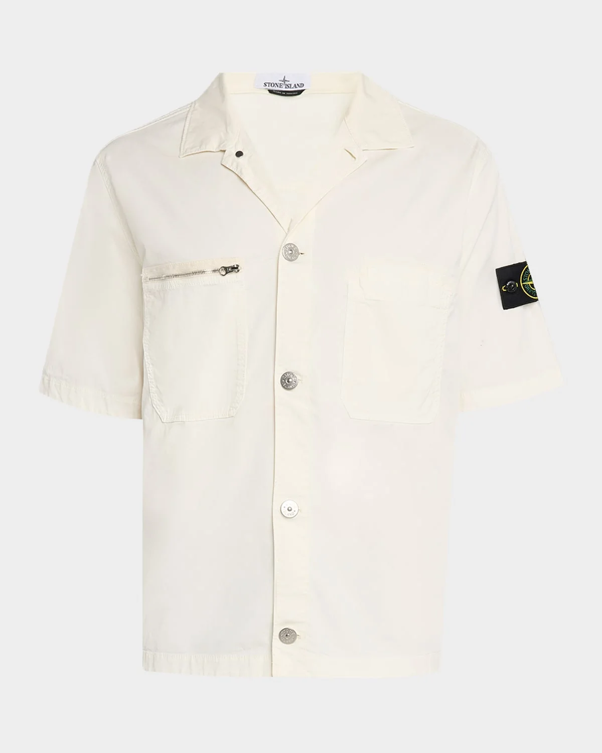 A cottonblend, designed with a subtle stretch, composes this Stone Island button shirt. Notice the distinct chest pockets that contribute to the smart fit of this casual overshirt. Point collar Short sleeves Logo badge on the left arm Zip pocket and patch pocket Fivebutton front Yoked back Cotton/elastane/spandex Machine wash cold Imported