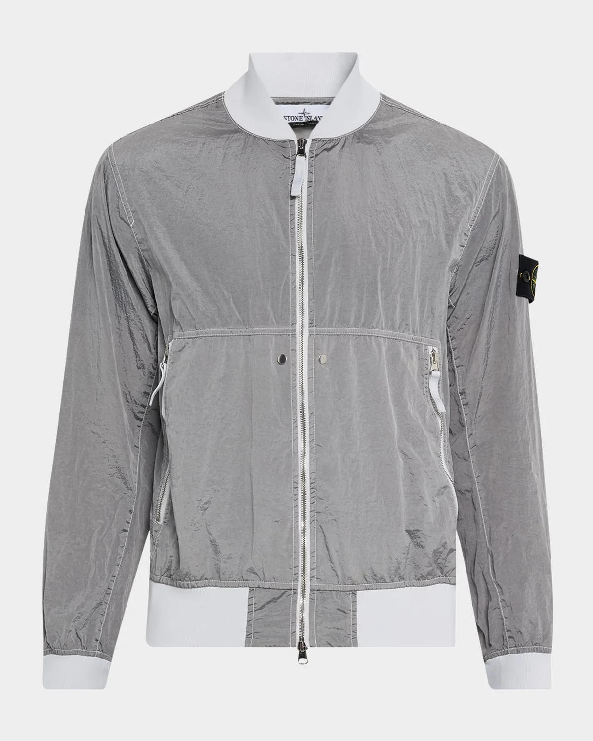 - Stone Island bomber jacket made from lightweight nylon with a metallic sheen - Ribbed stand collar - Two-way zip closure - Pouch pocket with side zippers - Long sleeves - Signature Compass badge on sleeve - Ribbed cuffs and hem - Nylon/polyamide/elastane - Imported