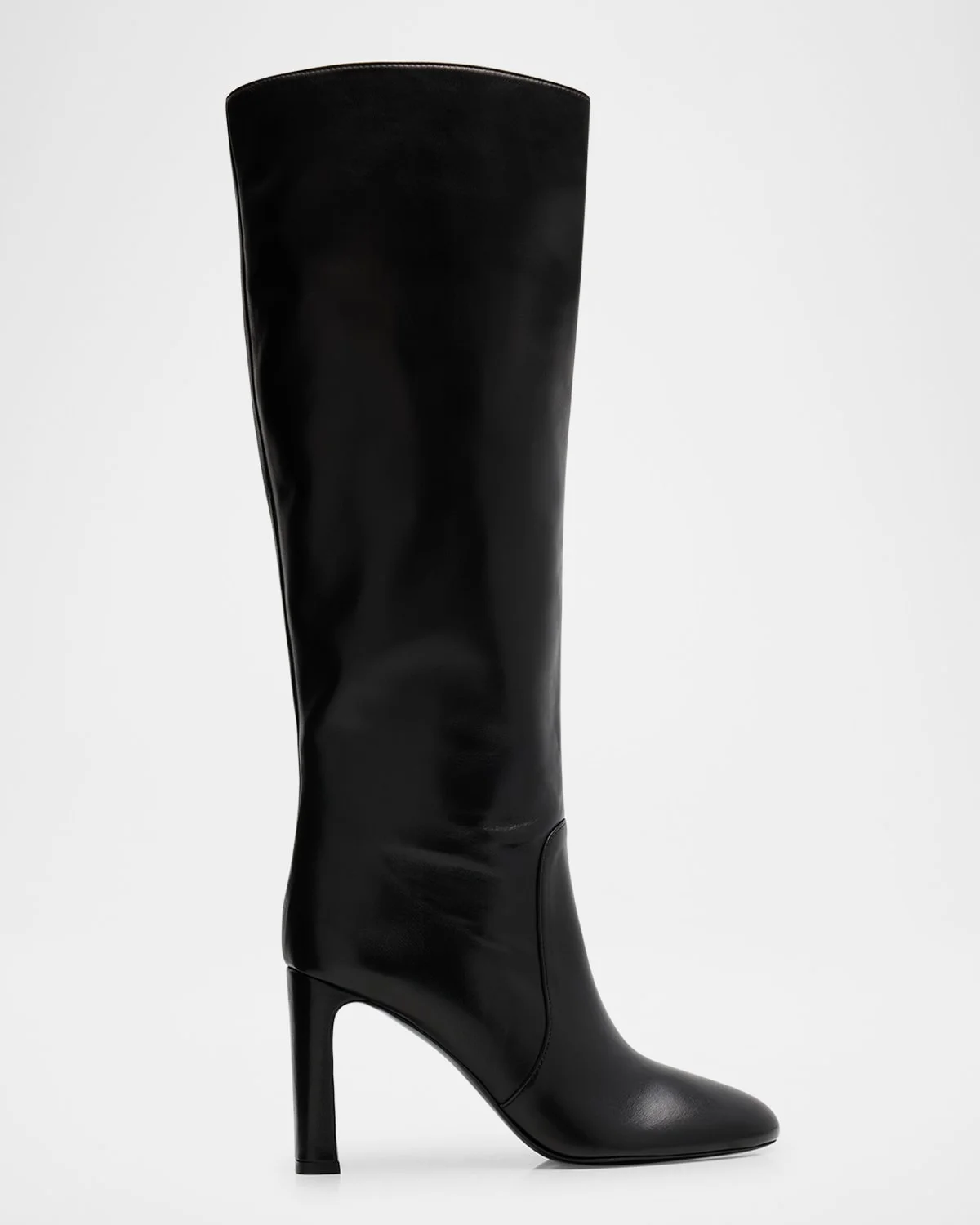 Stuart Weitzman "Babette Tubo" kneehigh boots in smooth calf leather 3.25 in / 85 mm covered block heel Almond toe Pullon style Leather lining and outsole Professional cleaning recommended Made in Spain