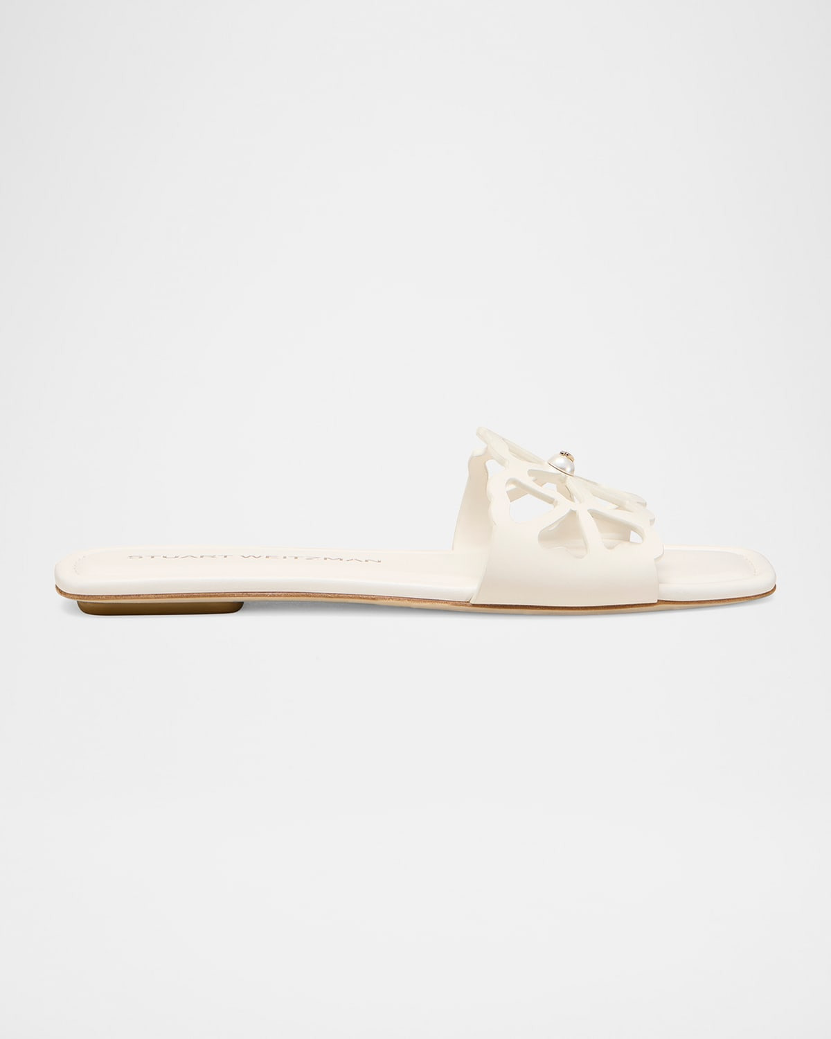 - Stuart Weitzman "Jasmine" smooth calf leather sandals with floral-inspired cutout detailing and a pearly stud logo medallion accent - 0.17 in / 5 mm flat heel - Open toe - Caged vamp - Slide style - Leather outsole - Lining: Leather - Spot clean, hand wash - Imported - Shipping - Direct from Vendor, usually ships within 30 business days.
