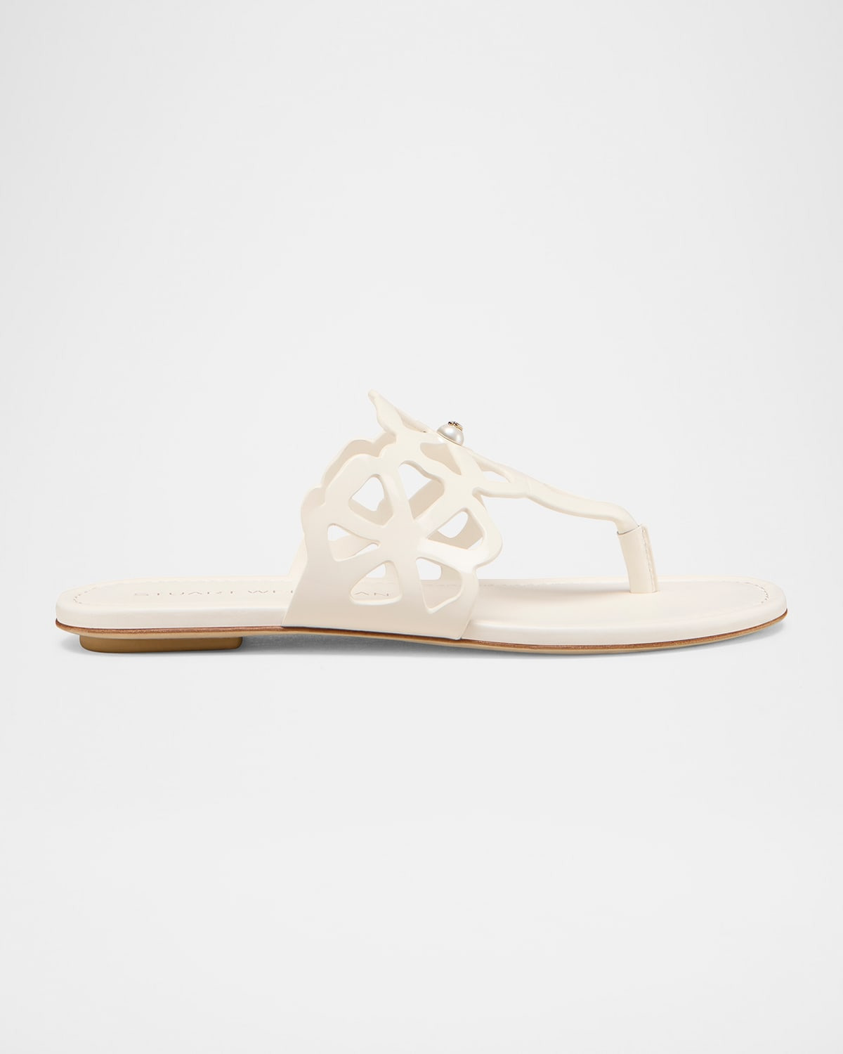 - Stuart Weitzman "Jasmine" patent leather sandals with floral-inspired cutout detailing and a pearly stud logo medallion accent - 0.17 in / 5 mm flat heel - Thong strap - Caged, T-strap vamp - Slide style - Leather outsole - Lining: Leather - Spot clean, hand wash - Imported - Shipping - Direct from Vendor, usually ships within 30 business days.