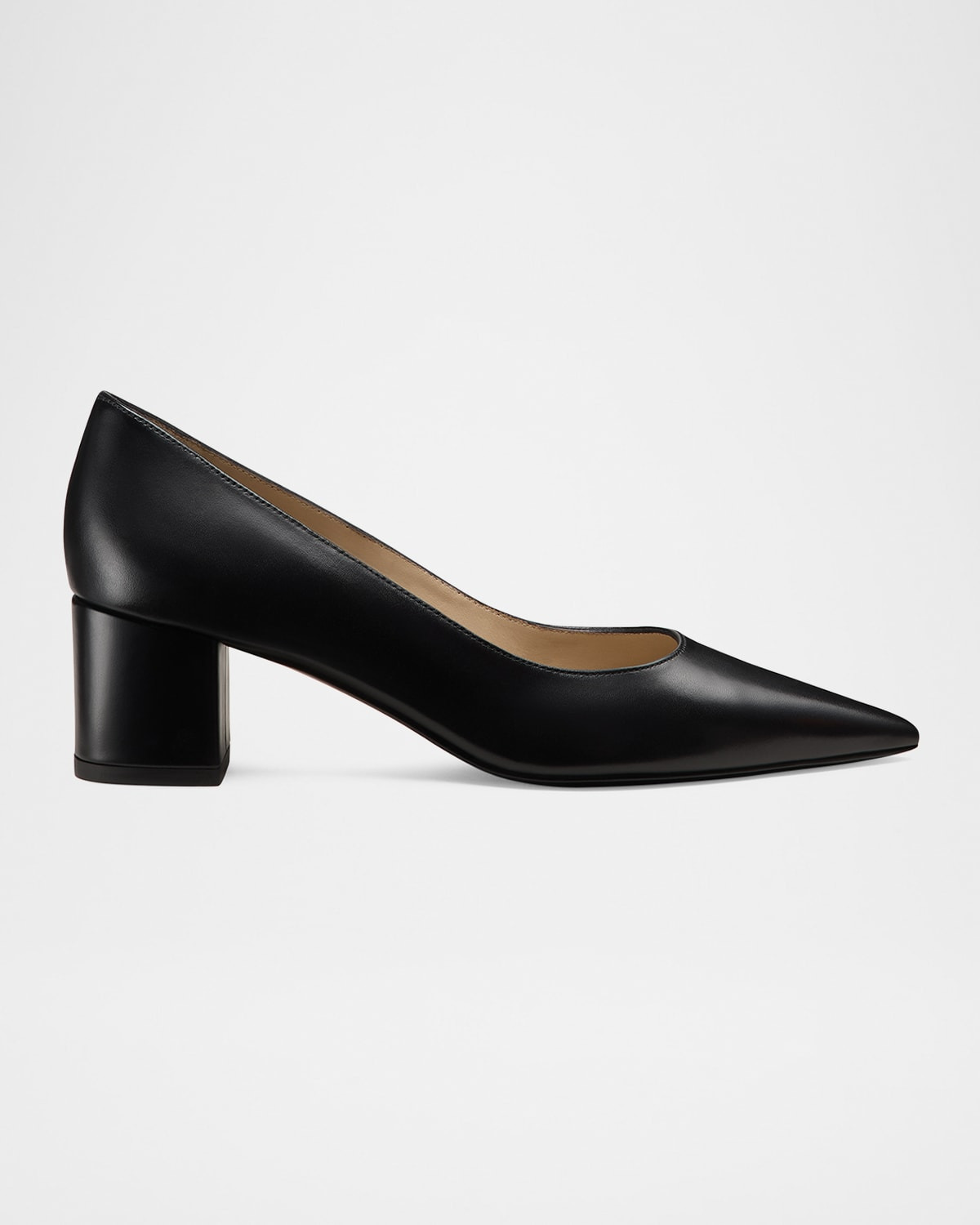 - Stuart Weitzman "Stuart" smooth calf leather pumps - 2.00 in / 50 mm block heel - Pointed toe - Slip-on style - Leather outsole - Lining: Leather - Professional cleaning recommended, hand wash, spot clean - Made in Spain