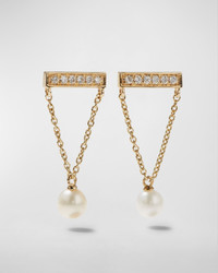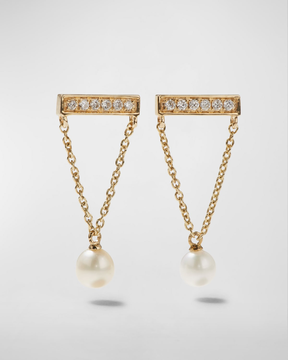Sydney Evan diamond bar and pearl earrings. Polished 14karat yellow gold hardware. White diamonds at eastwest bar posts. Chain dangles with white pearl drop. Naturally white freshwater cultured pearls. 0.072 total diamond carat weight. Post backs for pierced ears. Approx. 3.8"L x 3/4"W. Imported.