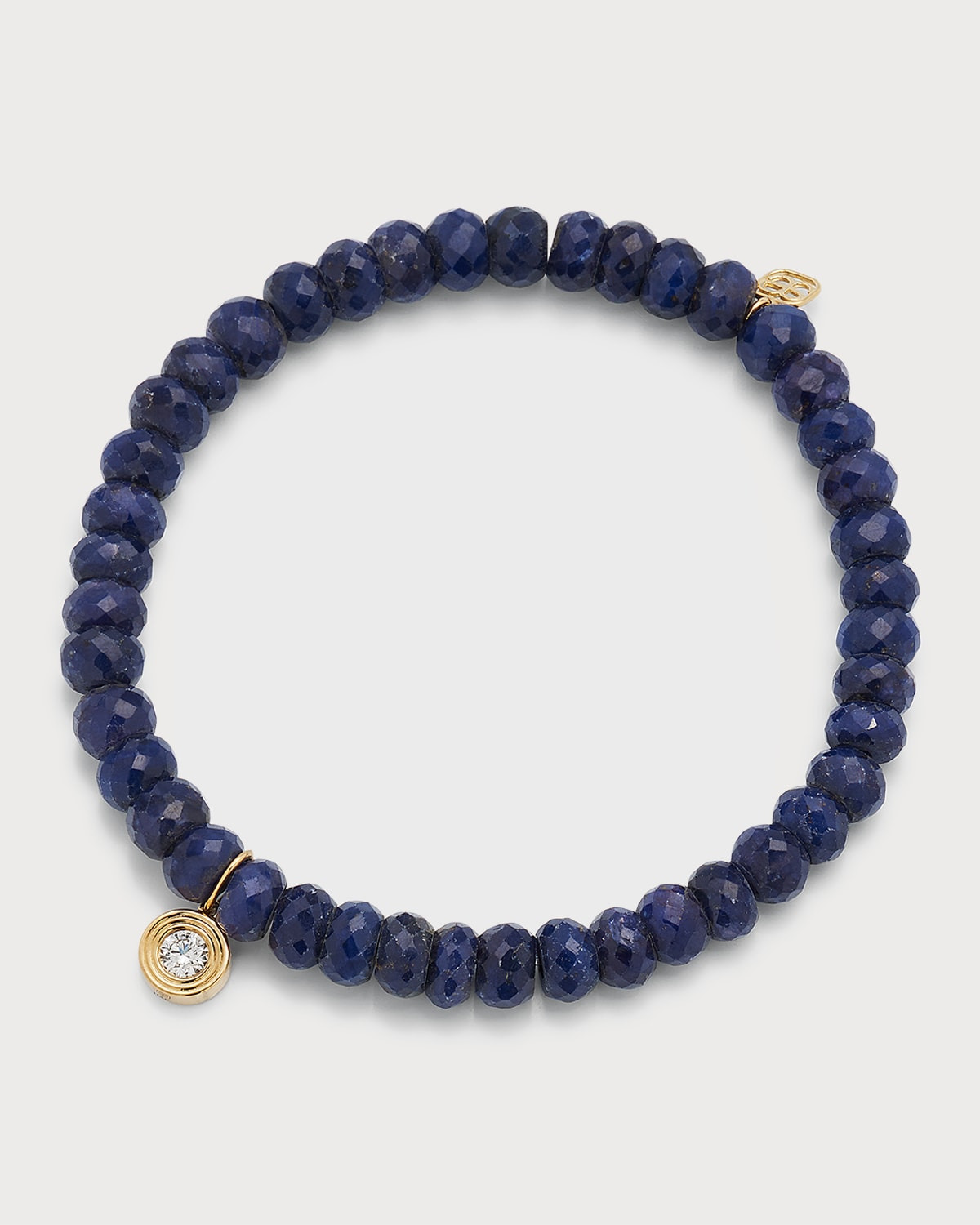 Sydney Evan bracelet 14karat yellow gold charms One brilliant round diamond Faceted blue sapphire rondelles Diamond total carat weight: 0.18 Slipon style Wipe clean Imported