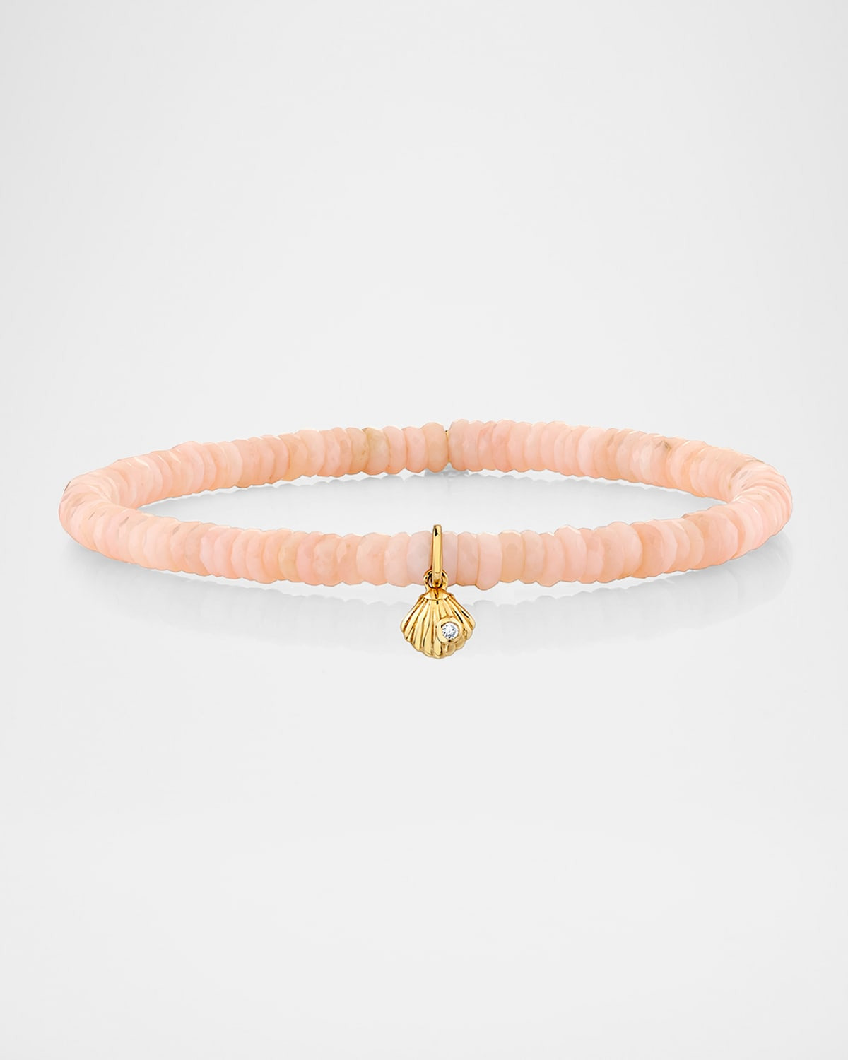 - This stretch bracelet from Sydney Evan is strung with faceted pink opal heishi beads. A scalloped shell and white H-I diamond charm hangs from the bracelet. - Polished 14-karat yellow gold - Diamond total carat weight: 0.01 - Stretchy; slip-on style - Spot clean, wipe clean - Imported