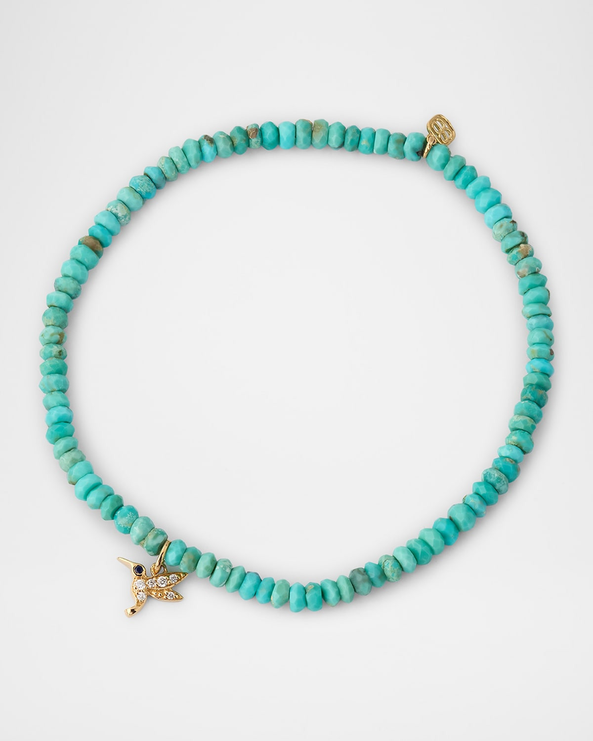 14K Yellow Gold Tiny Hummingbird Diamond Charm and Arizona Turquoise Bead Bracelet