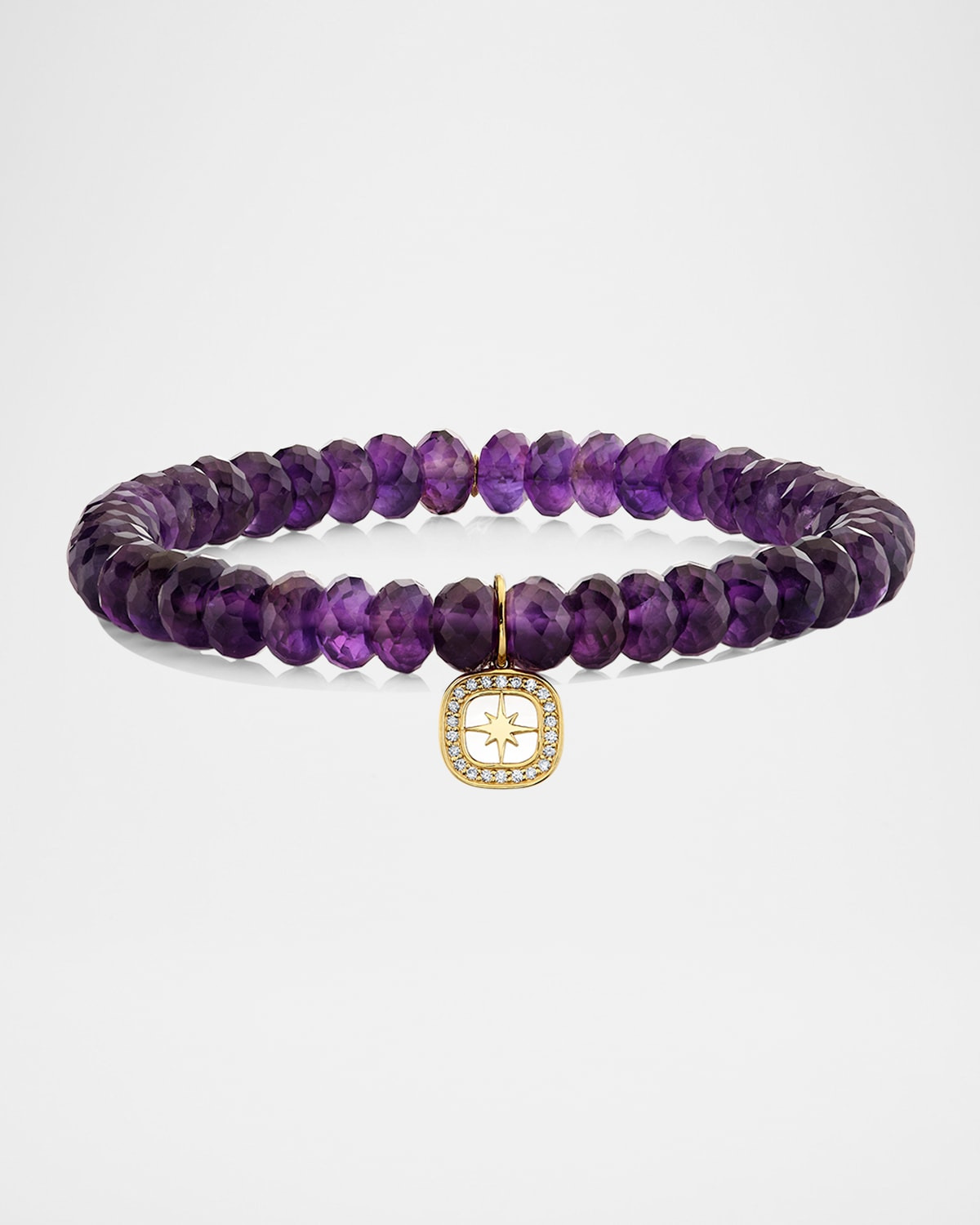 A starburst silhouette gently hangs from this Sydney Evan amethyst bracelet. The startbust silhouette is framed by a diamond halo that adds extra shine to this piece. Polished 14karat yellow gold 22 HI colorless diamonds 0.07 total diamond carat weight Faceted purple amethyst rondelles Stretches to fit Imported