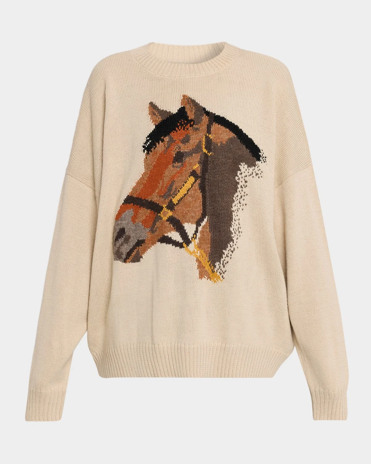 A bold horsehead intarsia motif sprawls across the front of The Great "Stable" sweater, evoking old west iconography. Ribbed finishes on the collar, cuffs, and hem Crew neckline Long sleeves Dropped shoulders Tunic length Oversized fit Pullover style Alpaca/Drytex acrylic/wool Dry clean Made in Peru