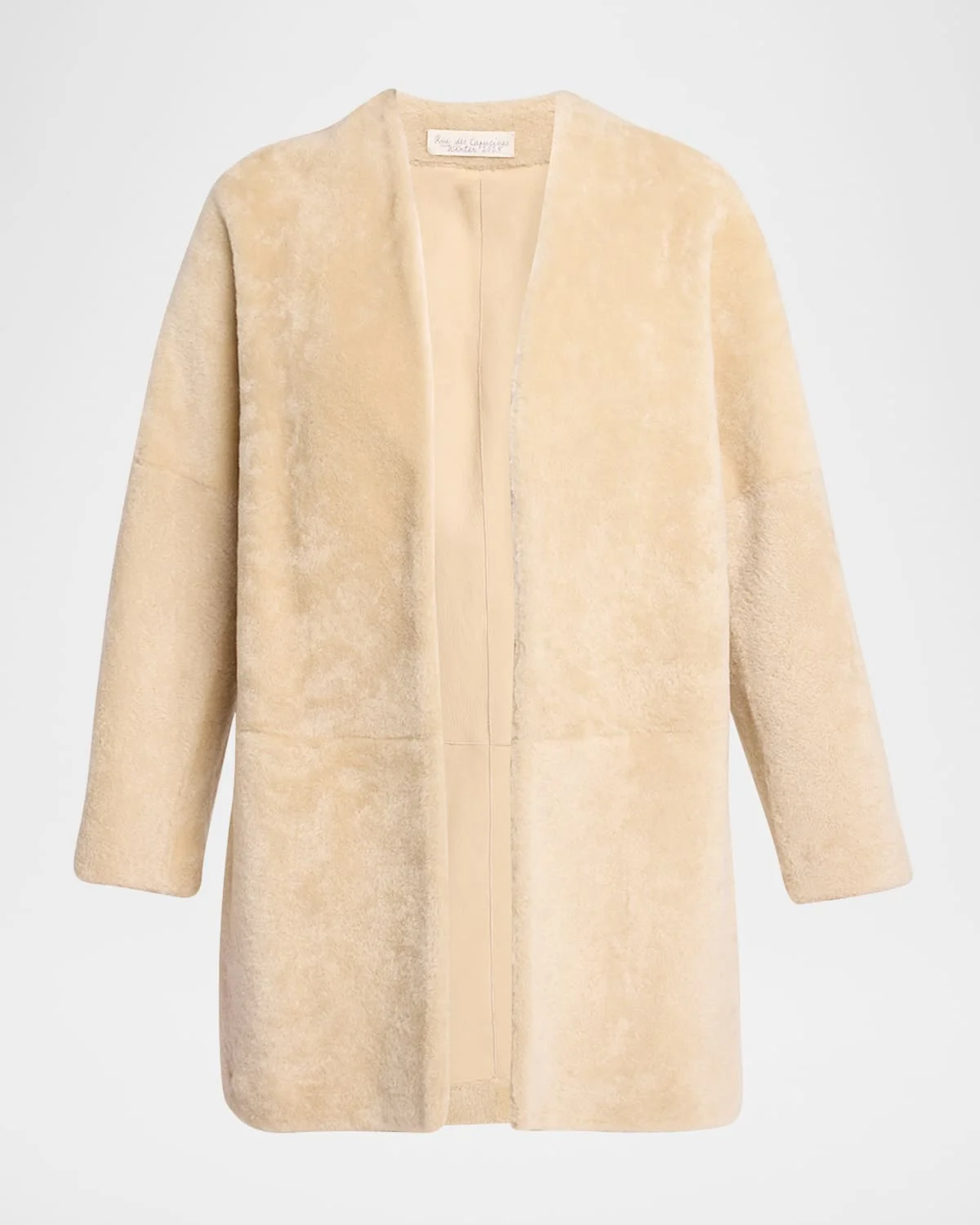 THE ROW "Alarise" coat is crafted from a warm natural lamb shearling (Italy) with a silk satin lining Open front Long sleeves Straight fit Hem falls below the hip Fur/silk Made in Italy