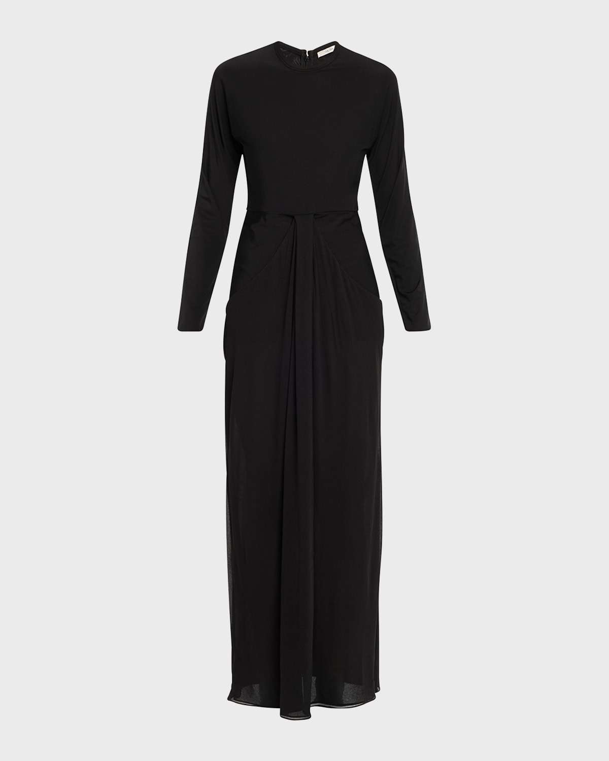- The Row "Anselm" ultra-soft jersey dress, featuring a gracefully draped center front box pleat - Round neckline - Long sleeves - Falls below the ankle - Column silhouette - Back vent - Back zip - Nylon/polyamide/elastane - Made in Italy