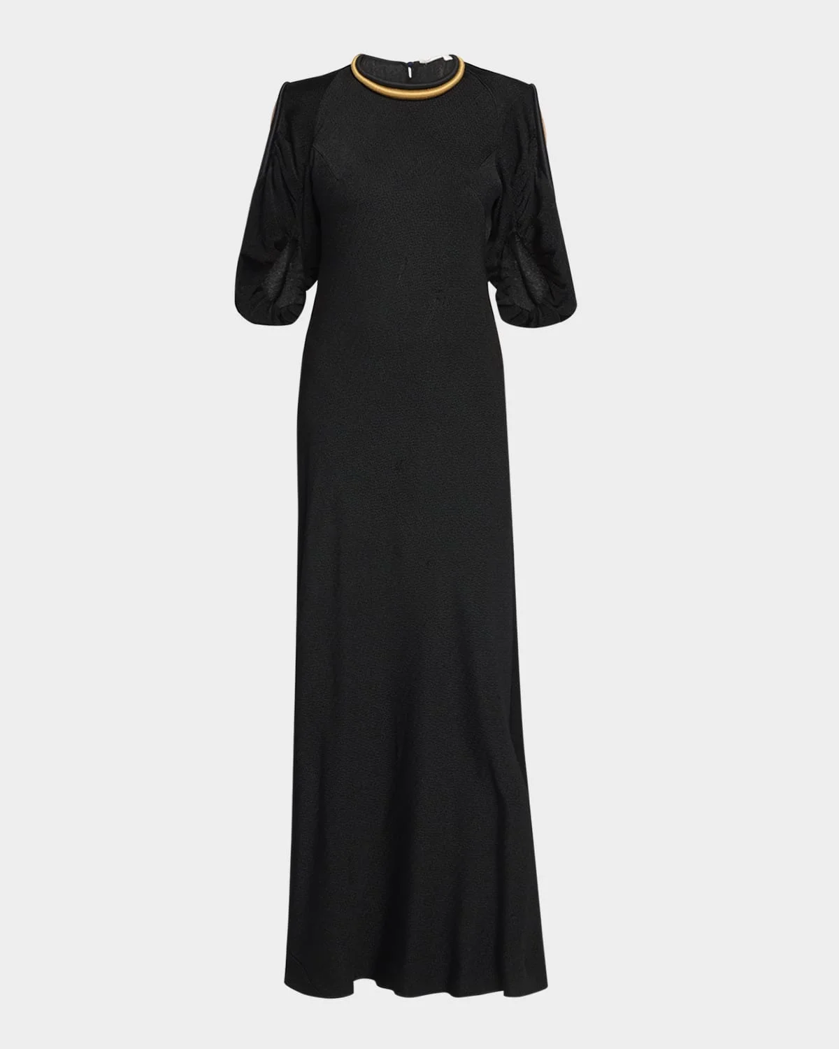 - THE ROW "Cedric" textured dress featuring embroidered tubular details and cold-shoulder cutouts - Round neckline; button/keyhole back - Short puff sleeves - A-line silhouette - Full length - Hidden closure - Viscose/silk - Made in Italy