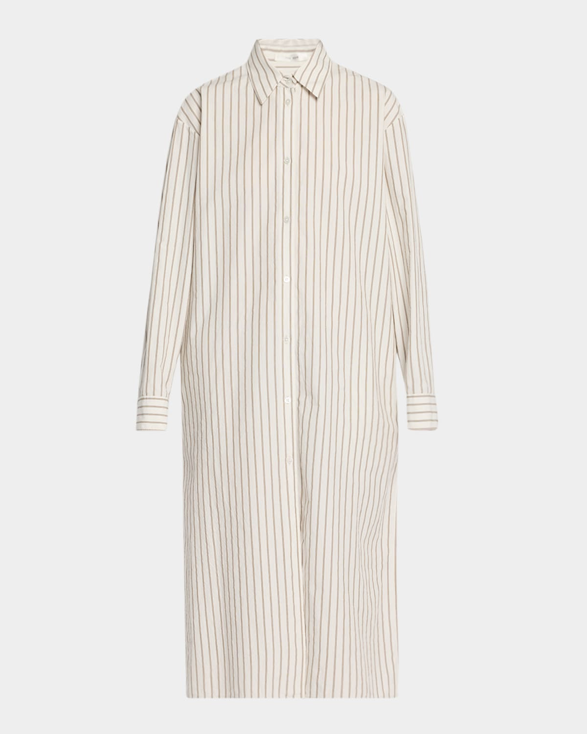 - THE ROW "Chihiro" shirtdress featuring a striped print and side slits - Point collar; button front - Long sleeves; button cuffs - Side split pockets - Shift silhouette - Hem falls below the knee - Shirttail hem - Cotton - Made in Italy
