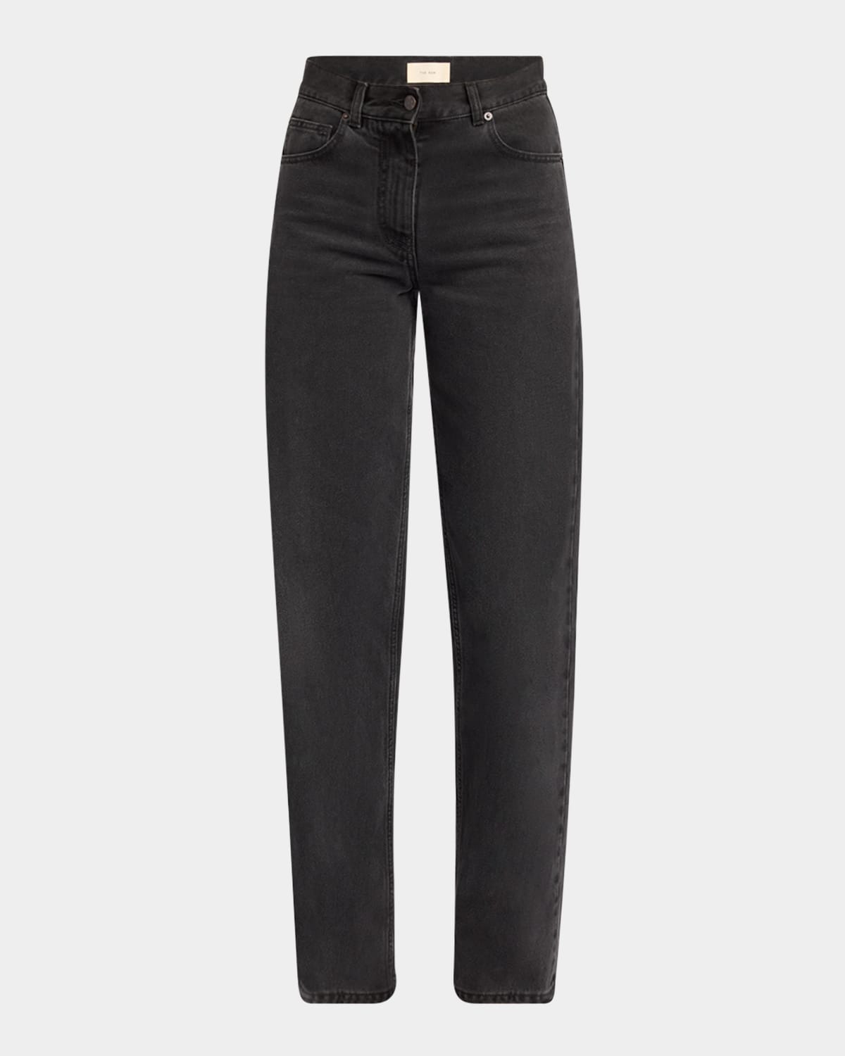 - THE ROW "Clair" jeans in a dark grey wash denim - Mid rise sits high on hip - Five-pocket style - Straight legs - Full length - Button/zip fly; belt loops - Cotton - Made in Italy