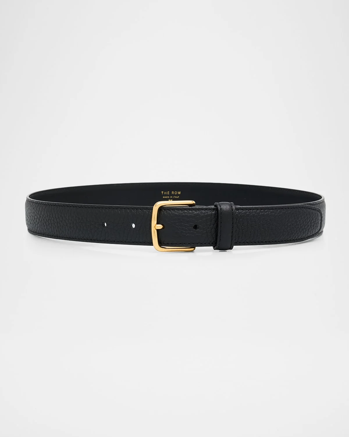 THE ROW classic belt is crafted of a pebbled calfskin leather Silvertone hardware Tapered end Topstitching Medium width Adjustable fit Leather/metal Made in Italy