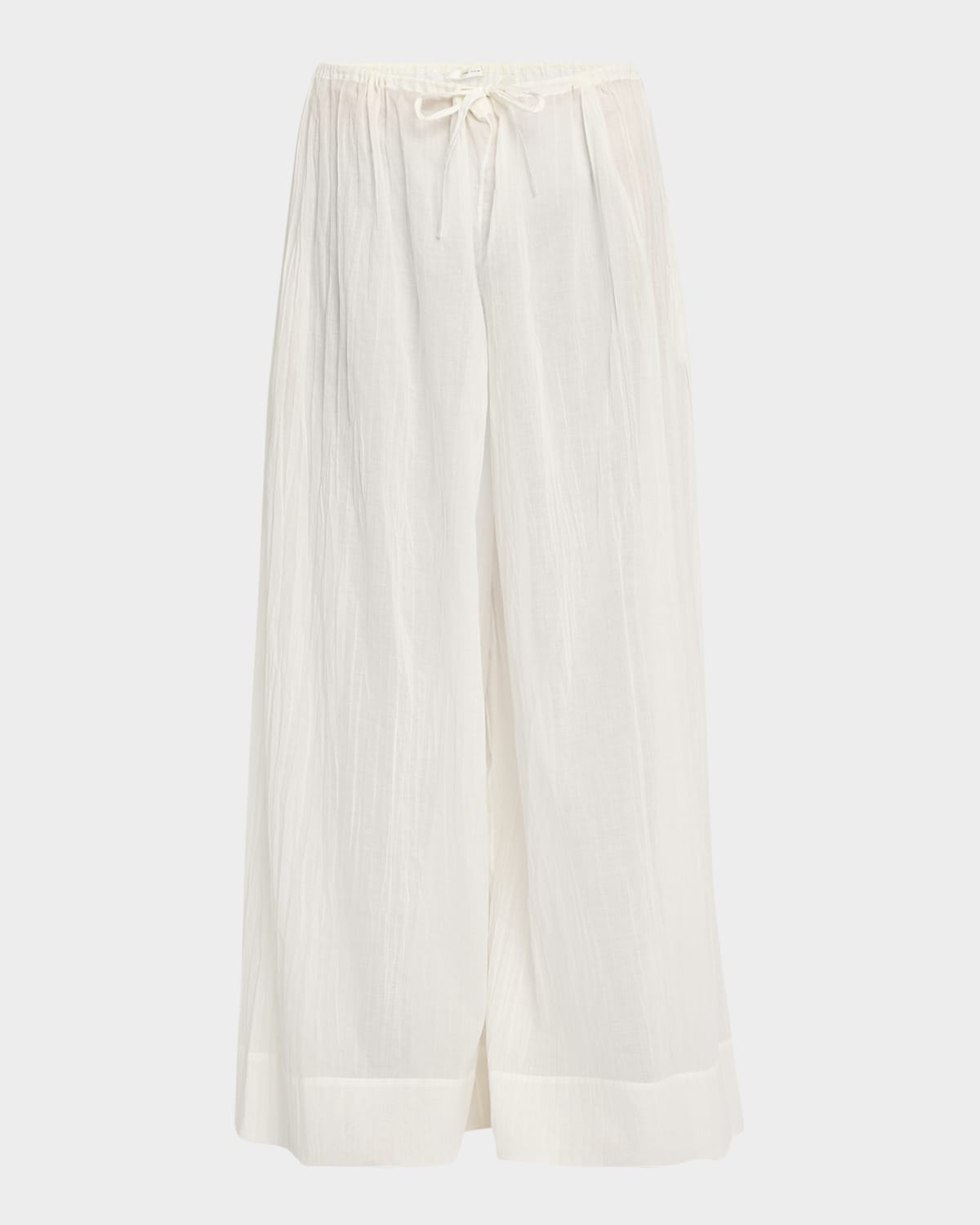 - THE ROW "Hypnosta" sheer pleated pants fetauring a drawstring waistband - Mid rise sits high on hip - Side split pockets - Wide legs - Full length - Pull-on style - Cotton - Made in Italy