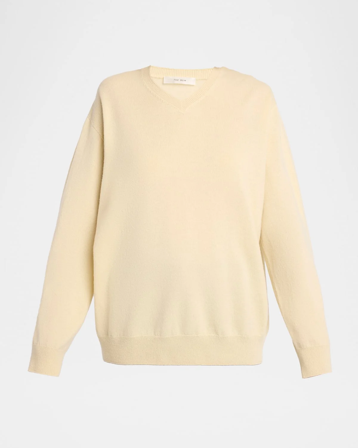 THE ROW "Migeia" sweater is crafted of a soft cashmere knit V neckline Long sleeves Loose fit Hip length Ribbed cuffs and hem Pullover style Cashmere Made in Italy