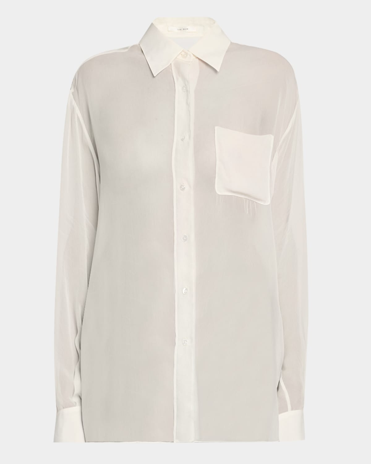 - THE ROW "Nesson" sheer cotton shirt - Point collar; button front - Long sleeves; button cuffs - Chest patch pocket - Oversized fit - Hem falls below the hip - Stepped hem - Cotton - Made in Japan
