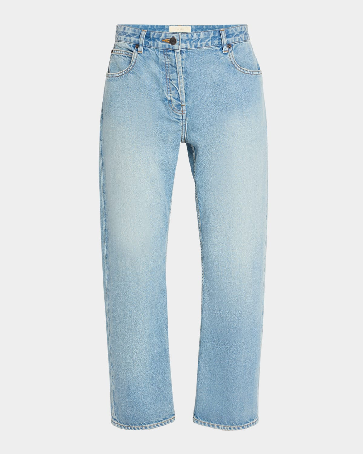 - THE ROW "Riaco" jeans in faded light-wash denim - Mid-rise; sits high on the hip - Five-pocket style - Slim fit - Full length - Button/zip fly; belt loops - Cotton - Made in Italy