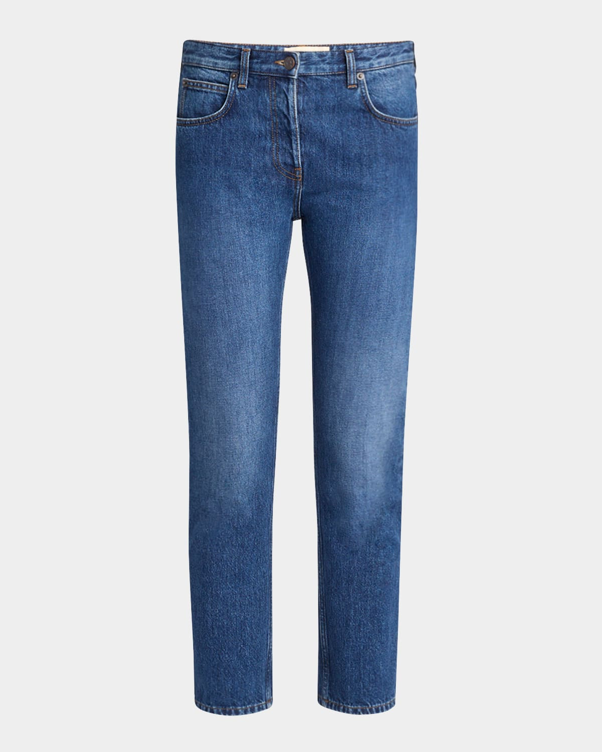 THE ROW "Riaco" jeans in medium wash denim with fading Mid rise sits high on hip Fivepocket style Straight legs Cropped at the ankle Button/zip fly; belt loops Cotton/polyester Lining: Cotton/polyester Made in Italy