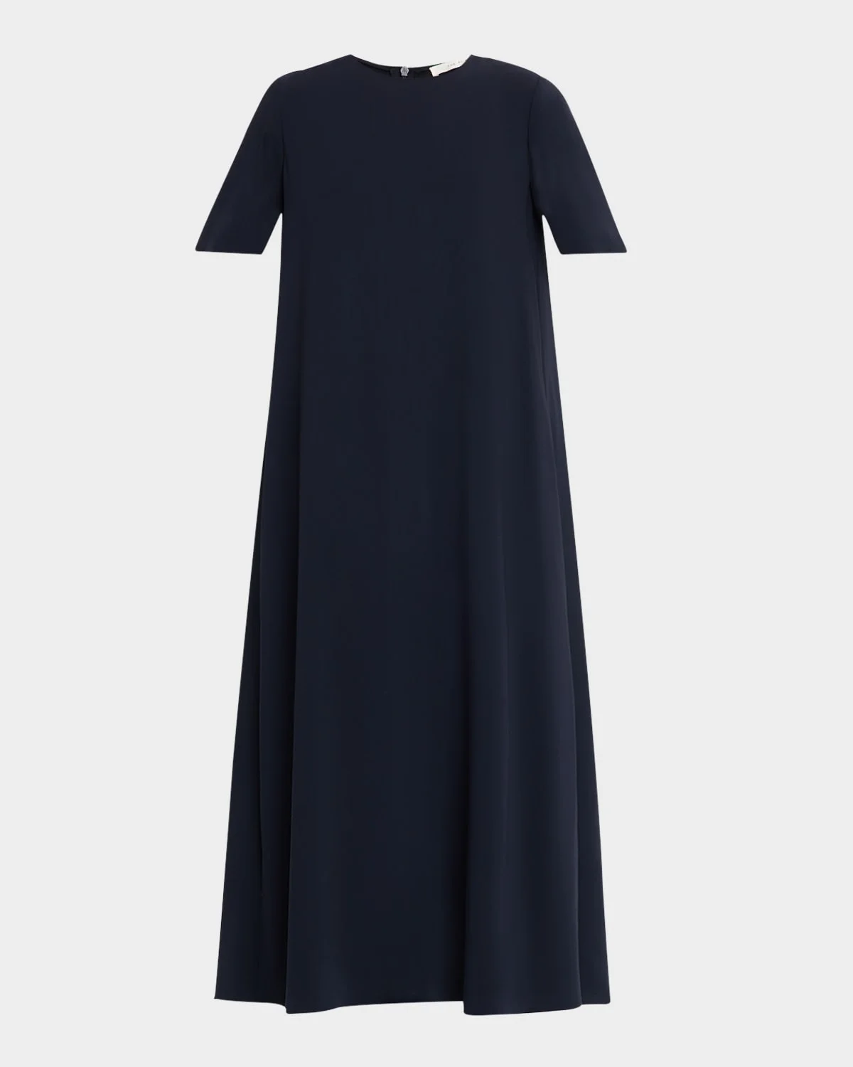 THE ROW "Robi" crepe dress. Crew neckline. Short sleeves. Side seam pockets. Aline silhouette. Tea length. Back zip. Triacetate/polyester. Made in Italy.