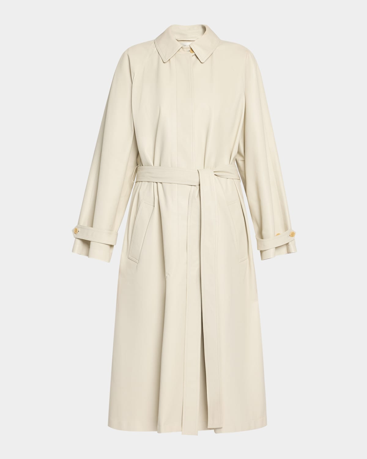- THE ROW "Ryota" trench coat in a smooth leather - Point collar; single-breasted front - Long raglan sleeves; button-tab cuffs - Self-tie cinched waist - Hip welt pockets - A-line silhouette - Hem falls below the knee - Back inverted back - Concealed button closure - Leather - Made in Italy