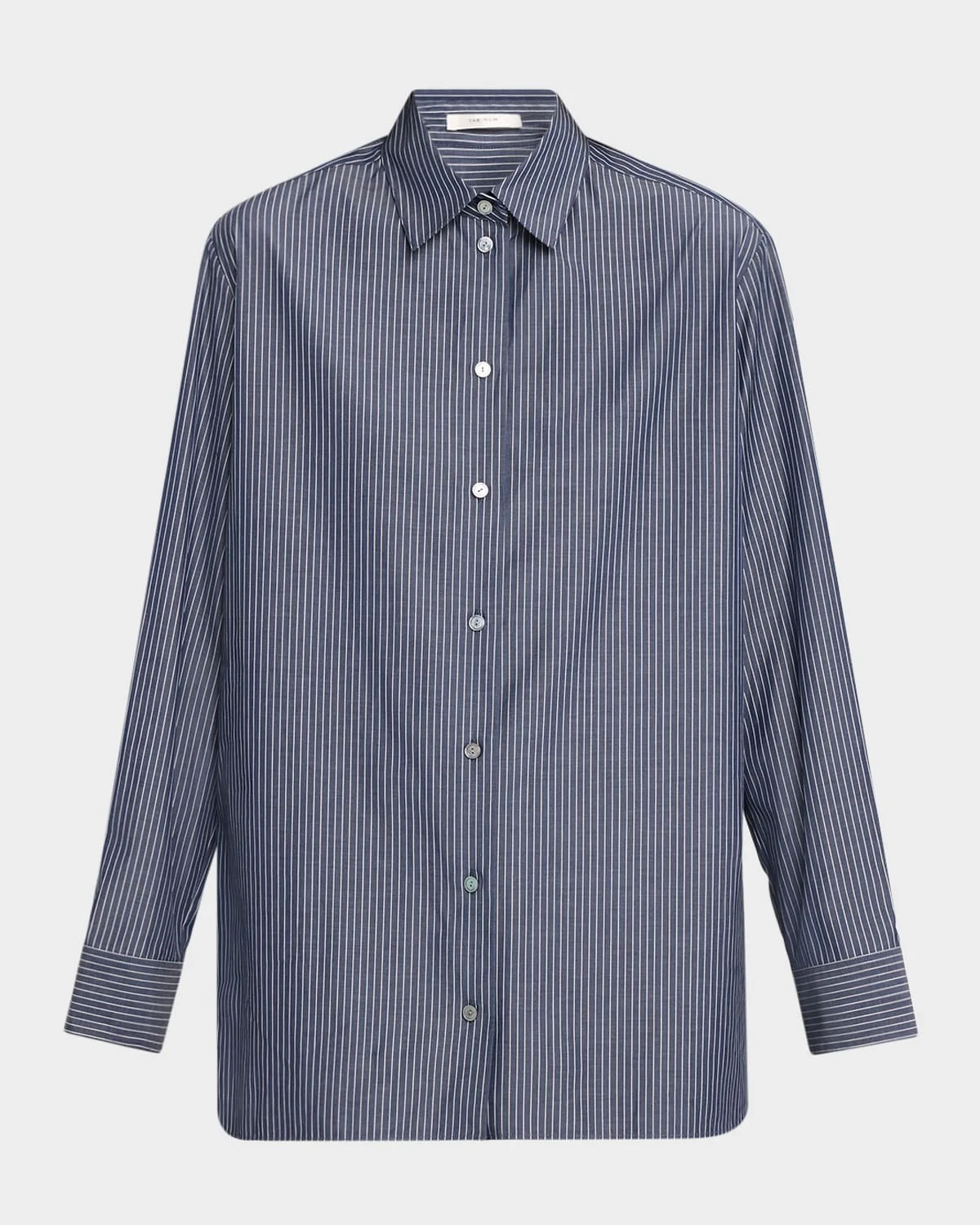 THE ROW "Sisilia" shirt is crafted of cotton popline with a striped print and adorned with motherofpearl buttons Point collar; button front Long sleeves; button cuffs Loose fit Hem falls below the hip Straight hem Cotton/motherofpearl Made in Italy
