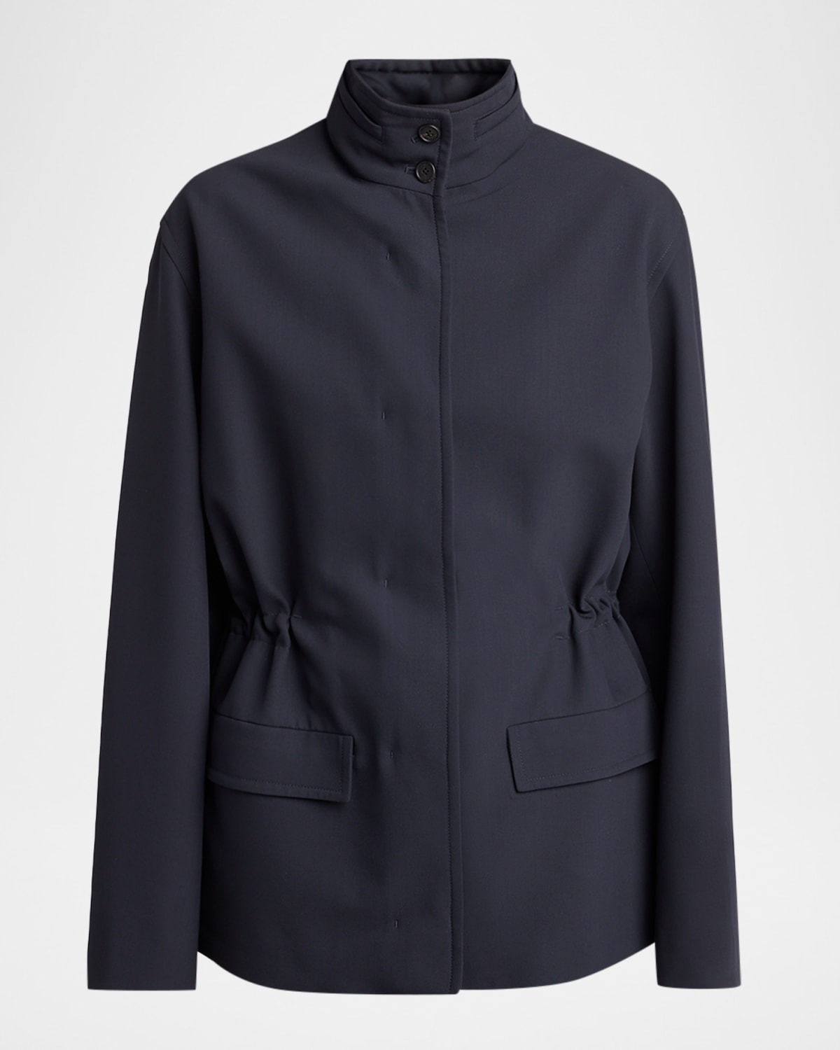 THE ROW "Tanera" jacket featuring a zip hidden hood Stand collar; concealed zip front Long sleeves Inner drawstring cinched waist Hip flap pockets Straight fit Hem falls below the hip Virgin wool/nylon/polyamide/silk Made in Italy