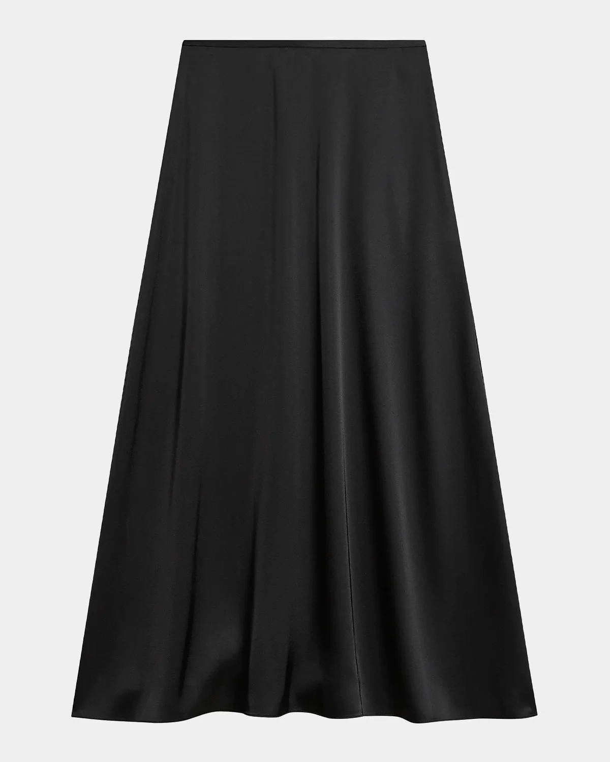 Minimalist luxe satin maxi skirt adorned with a narrow waistband by Theory. High rise Aline silhouette Full length Center back zip Triacetate Dry clean Imported