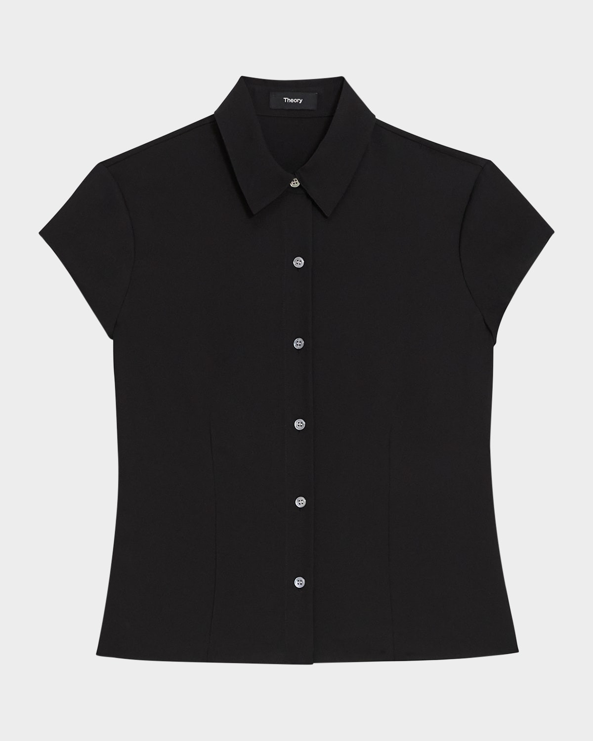 - Theory shirt blouse tailored with front and back darts - Approx. 20.5"L from shoulder to hem - Spread collar - Short cap sleeves - Button-front placket - Fitted - Silk - Dry clean - Imported - Size Note: Item runs small, consider ordering a size up. - Model height: 5'10"/177cm.