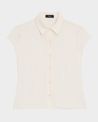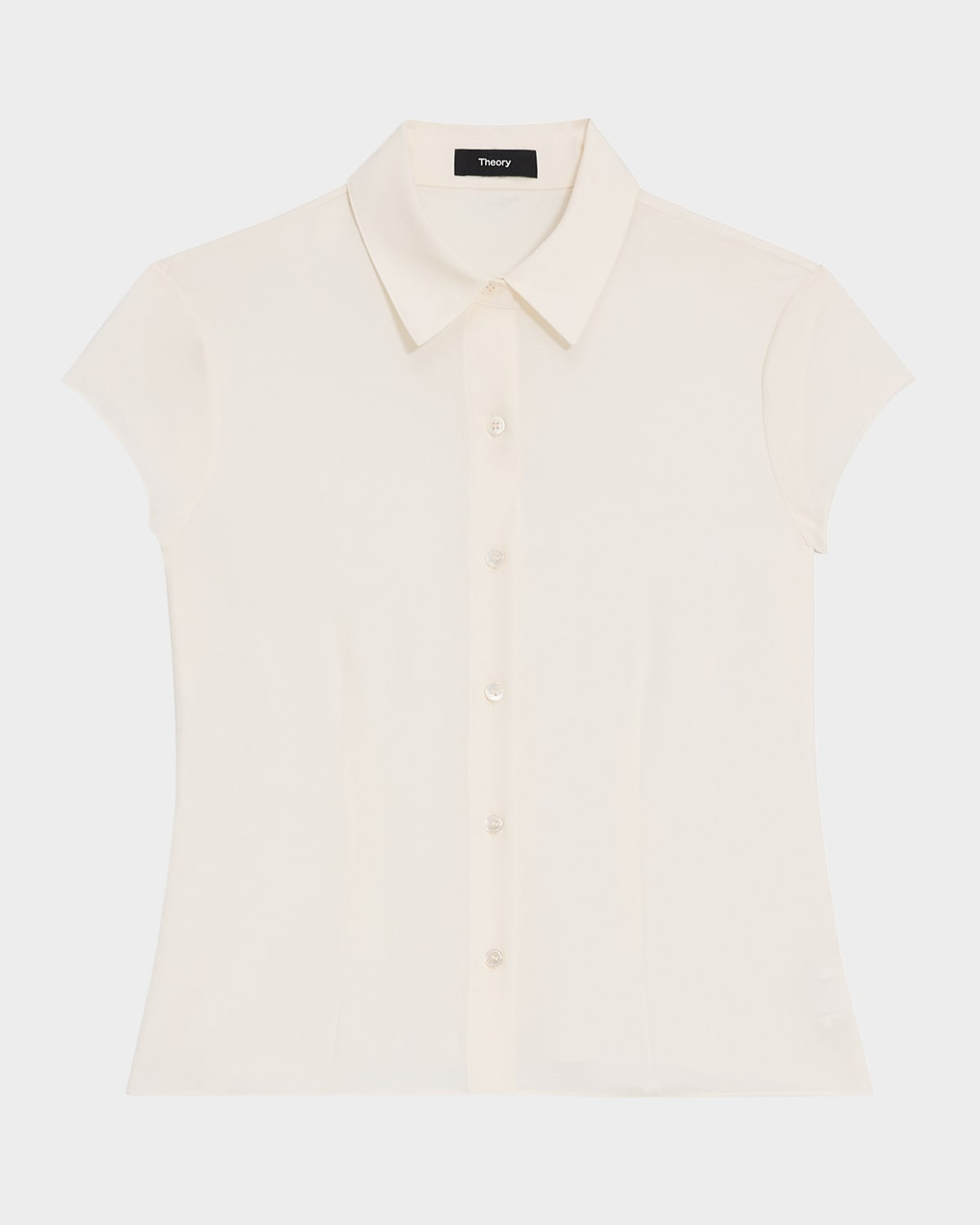 - Theory shirt blouse tailored with front and back darts - Approx. 20.5"L from shoulder to hem - Spread collar - Short cap sleeves - Button-front placket - Fitted - Silk - Dry clean - Imported - Size Note: Item runs small, consider ordering a size up. - Model height: 5'10"/177cm.