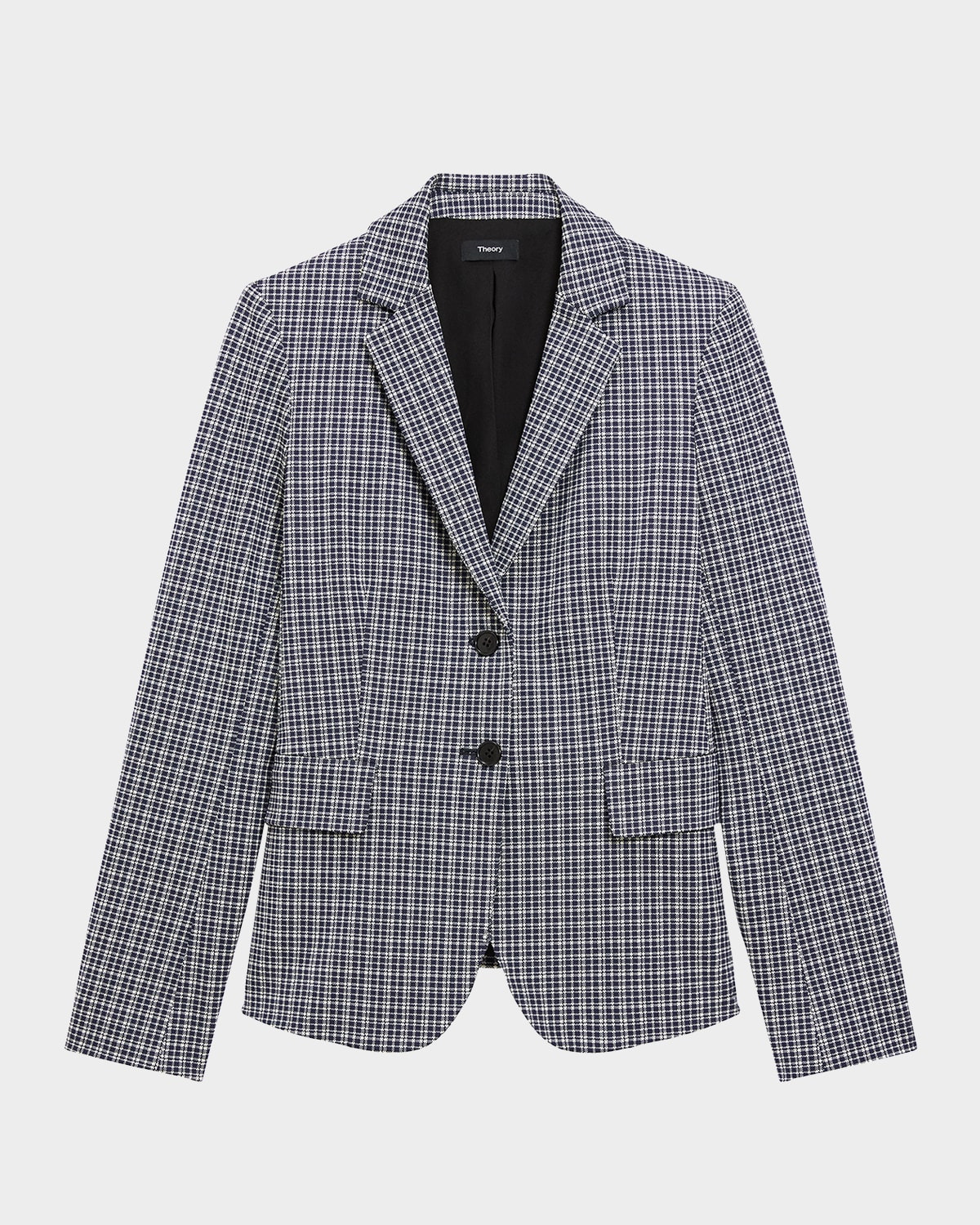 - Theory "Carissa" single-breasted blazer in plaid - Notch lapels - Long sleeves with button cuffs; approx. 32"L - Hip flap pockets - Slim fit - Vented back - Button-front - Nylon/polyamide/elastane - Dry clean - Imported