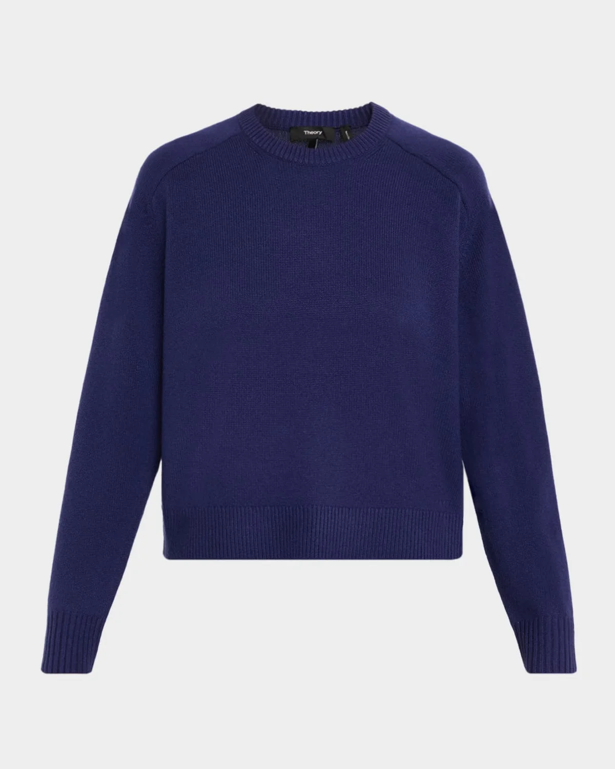 - Theory easy sweater with tapered sleeves and a ribbed finish - Approx. 20"L from shoulder to hem - Crew neckline - Long sleeves - Hip length - Relaxed fit - Pullover style - Cashmere - Dry clean - Imported - Model is 5'10"/177cm.