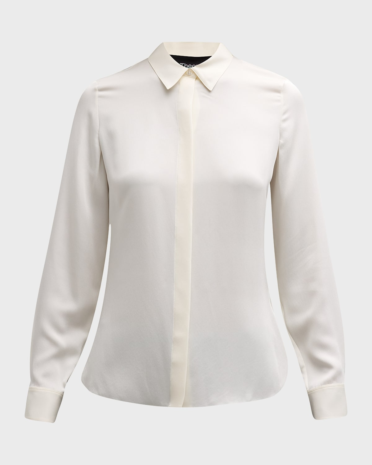 - Theory silk shirt with back vertical darts - Spread collar; hidden button front - Long sleeves; button cuffs - Back yoke - Rounded hem - Classic fit - Silk - Item runs small, consider ordering a size up - Imported - Model is 5'10"/177cm.