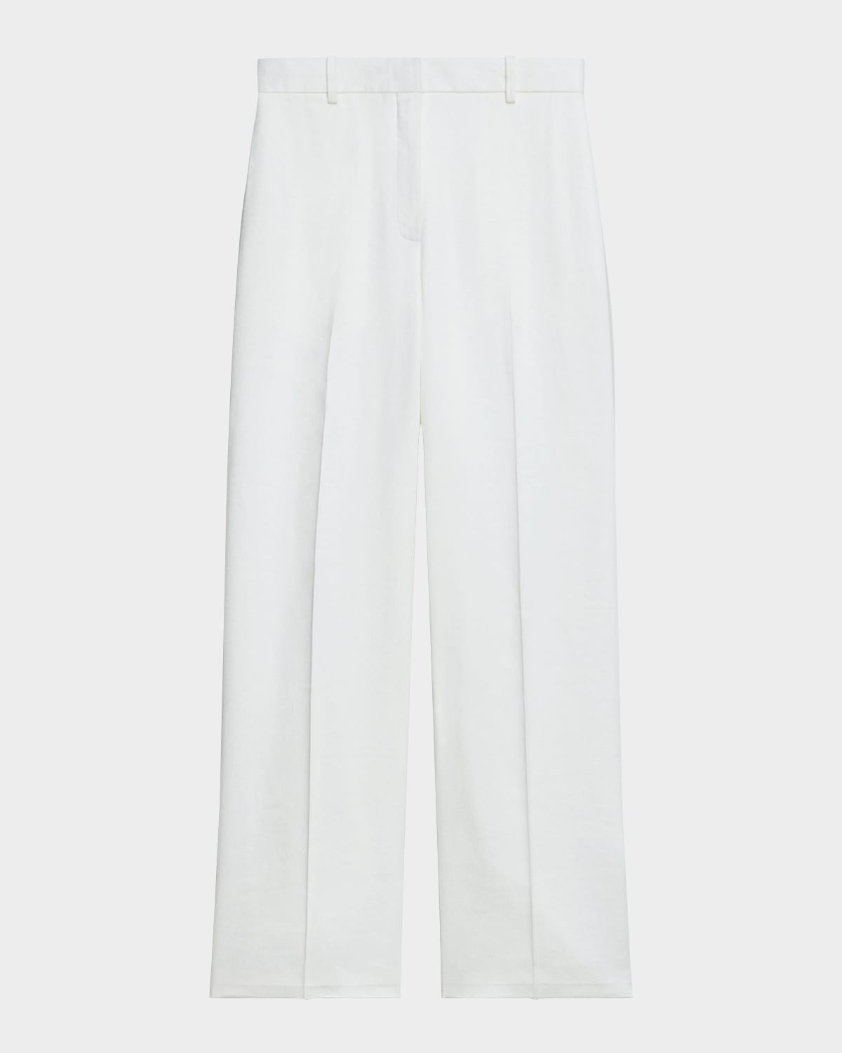 - A classic, straight, high-rise trouser with on-seam pockets at the front, buttoned welt pockets at the back, and classic belt loops. - Theory classic linen-blend trousers - Approx. 11" rise; 32" inseam - High rise - Side seam pockets; back welt pockets - Straight legs - Full length - Hook/zip fly; belt loops - Linen/viscose/elastane - Dry clean - Imported