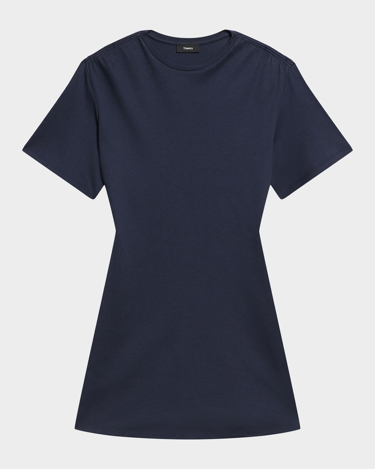 - Theory mini dress with shoulder ruching details - Crew neckline - Short sleeves; approx. 9"L - Defined waist - T-shirt silhouette - Hem falls above the knee - Slipover style - Supima® cotton - Machine wash cold - Imported