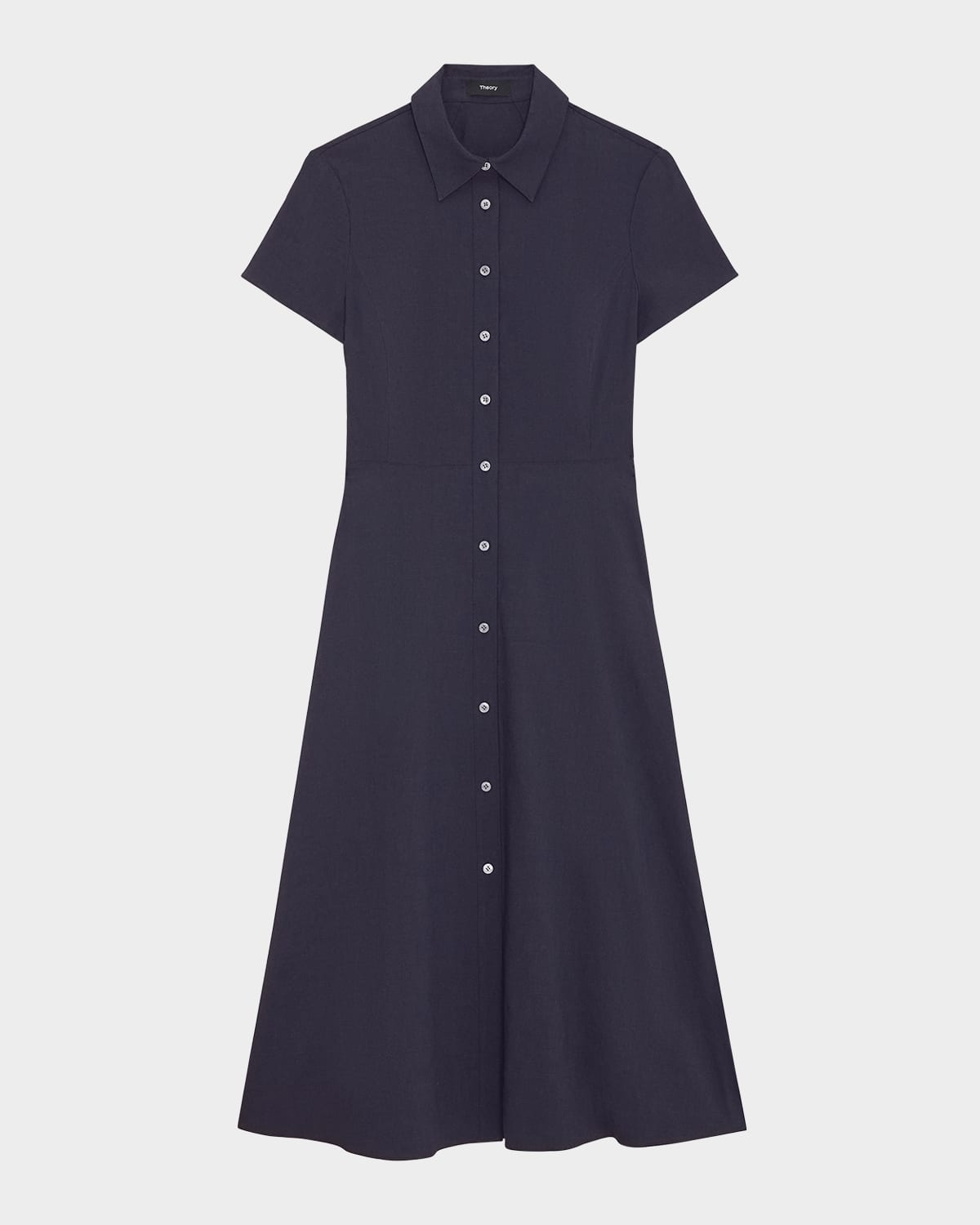 - Theory shirt dress with a fitted upper and full button placket - Approx. 46.3”L from shoulder to hem - Spread collar - Short sleeves; approx. 14.3"L - On-seam pockets - Hem falls below the knee - A-line silhouette - Linen/viscose/elastane - Dry clean - Imported - Size Note: Height: 5'11"/ waist 24”/ hips 35"/ bust 30" - Model is wearing size 2