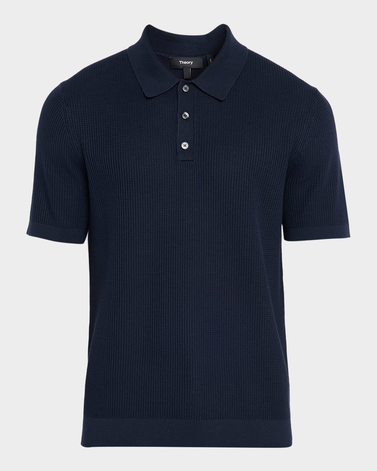 - Theory solid mesh polo shirt in premium cotton for a breathable finish - Spread collar - Three-button placket - Short sleeves - Ribbed cuffs and hem - Pullover style - Cotton - Hand wash or dry clean - Imported