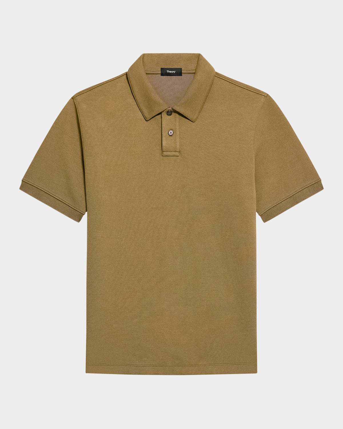 - Theory "Delroy" double-knit polo shirt with classic pique face and super smooth jersey backing - Flat collar - Two-button placket - Cuffed short sleeves - Pullover style - Cotton/polyester/spandex - Machine wash cold, line dry - Made in Peru - Model is 6'1"/185cm.